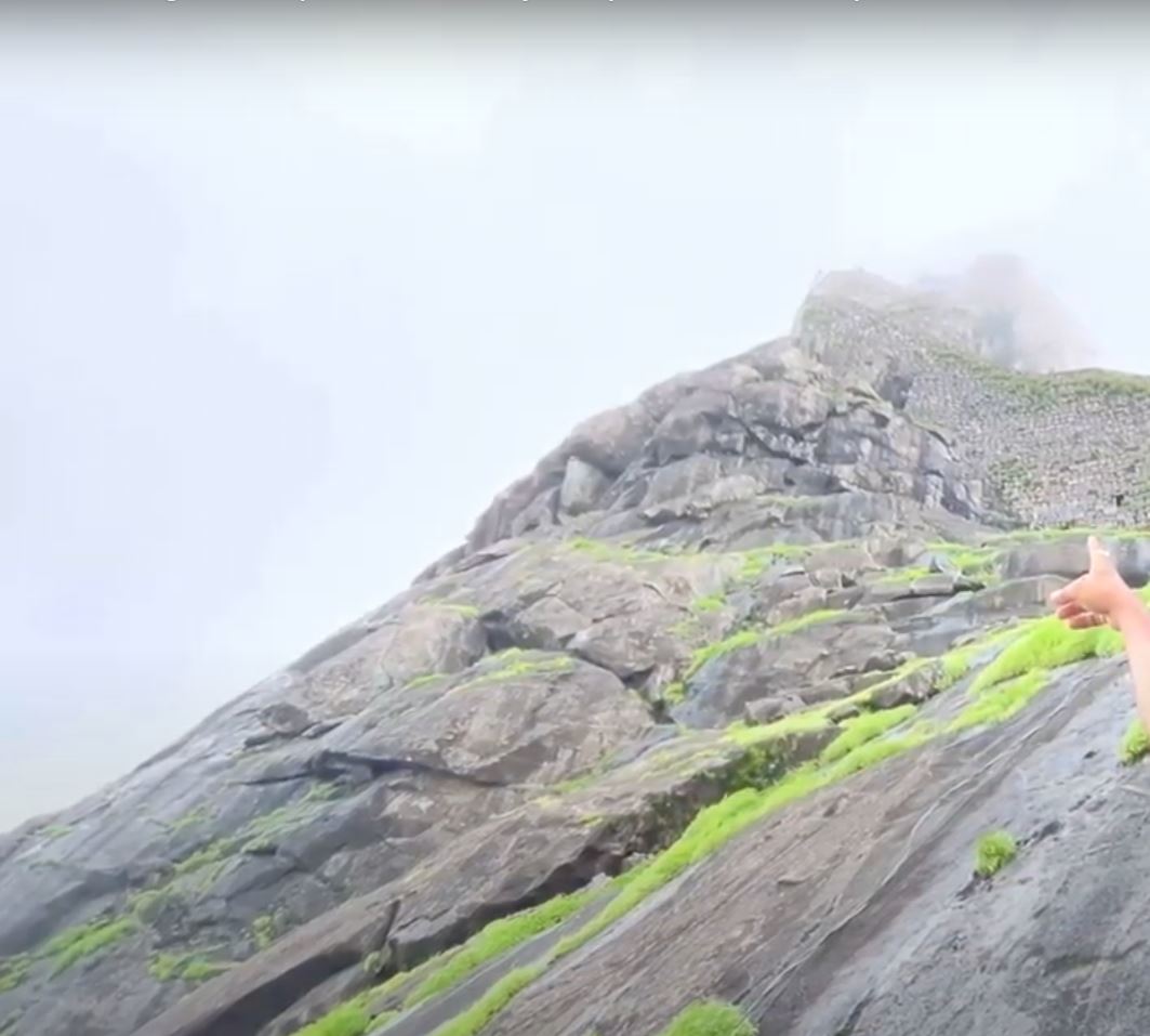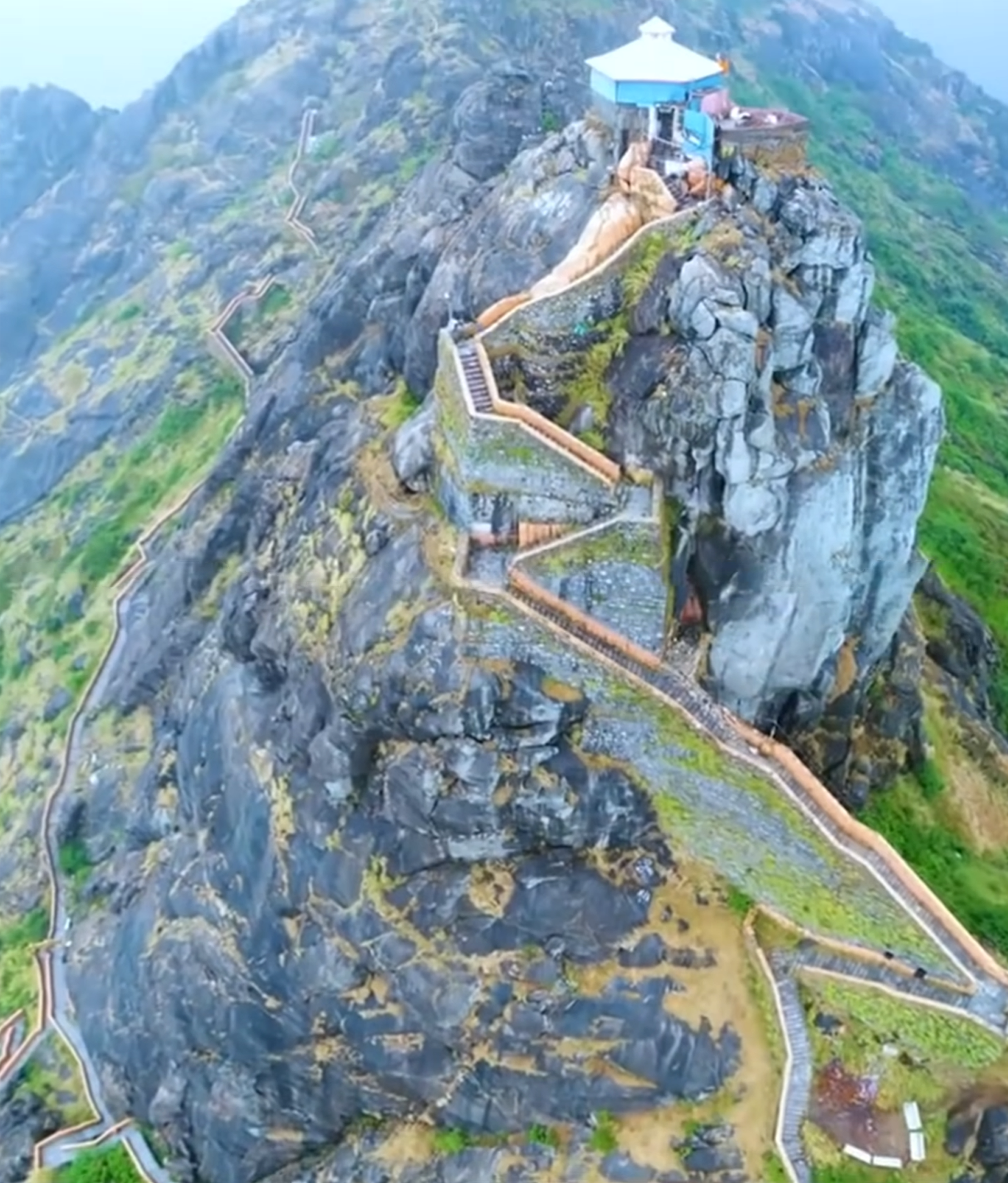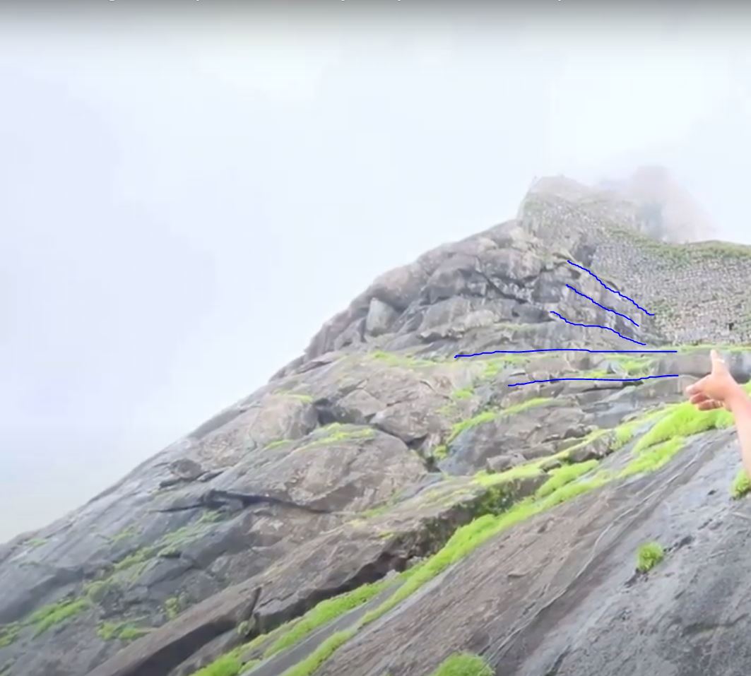 The Dattatreya Temple sits atop formations of hexagonal shapes as well as a section having a flat-faced wall, as pictured here: