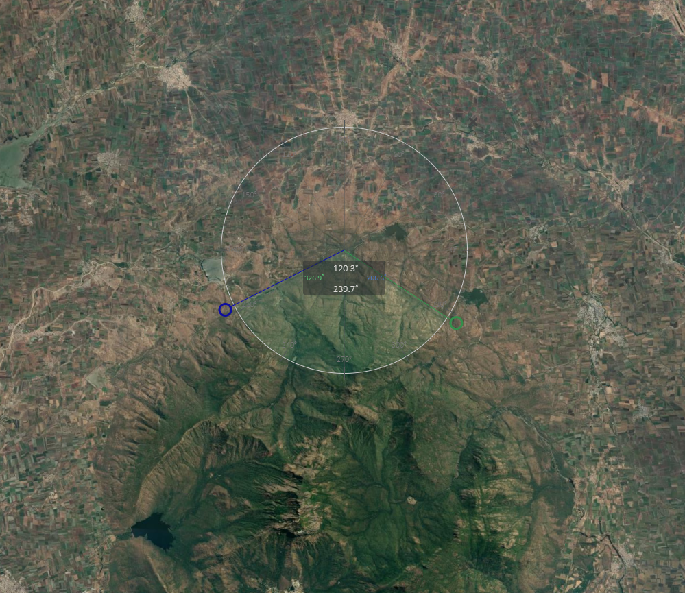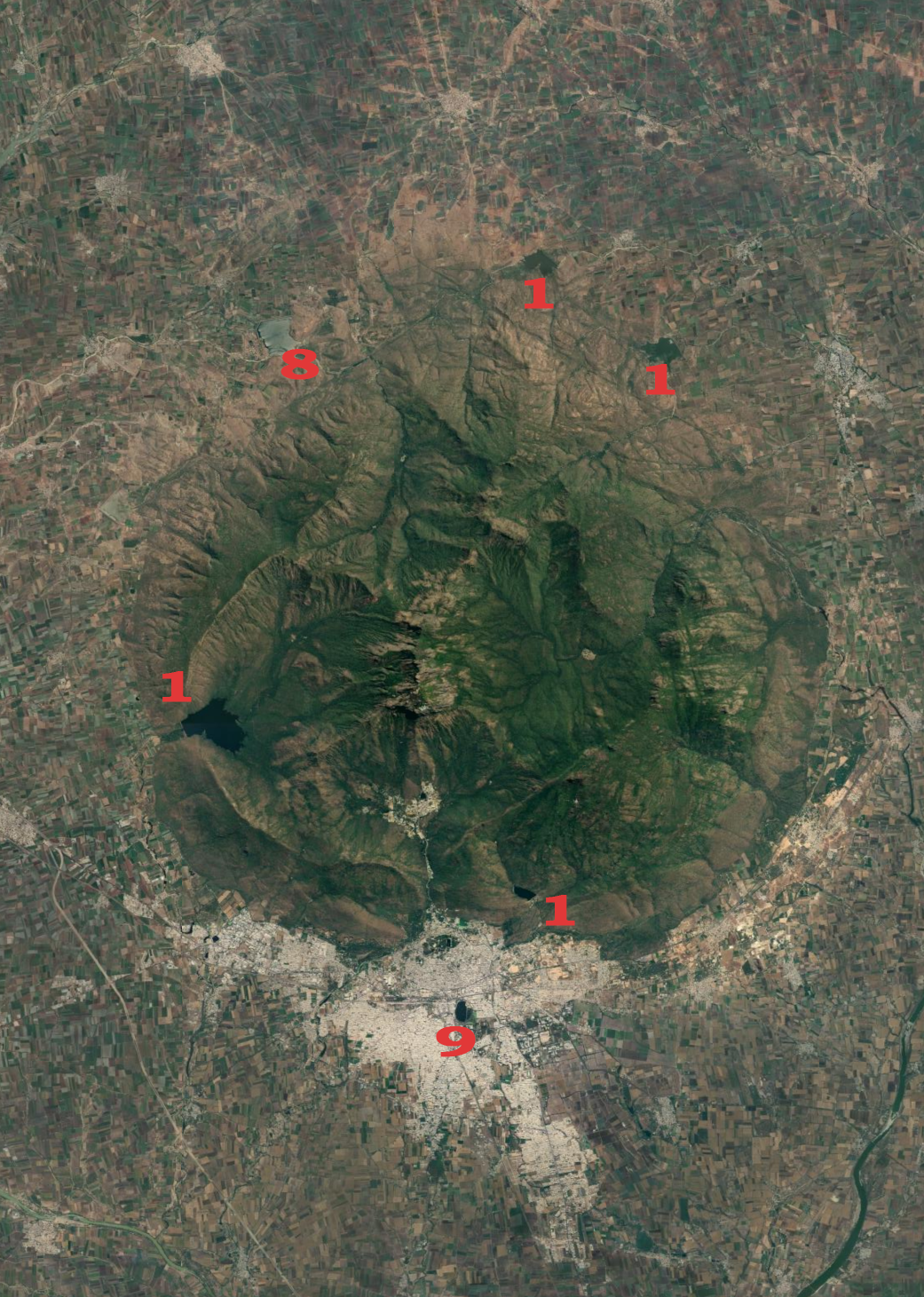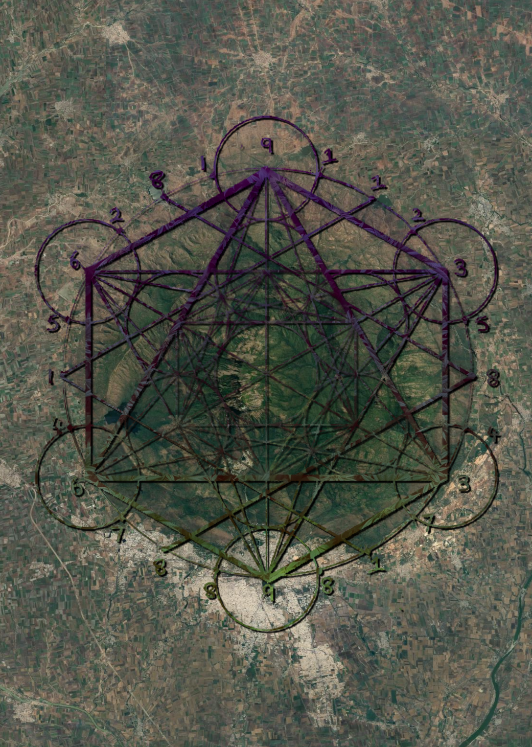 The two lakes in the top right are positioned at 1 positions, as depicted below. The lake at the 8 position is fed by an outlet flow from the mountain that exits at a 1 position. Two additional lakes are positioned along lines involving the 1 value. A last lake is positioned at the 9 value opposite to the defined hexagonal point of the mountain and where the population of the region is most localized--making it, in a sense, a 0 position. And thus the low points of the region also are where low values in the sacred geometry pattern occur: