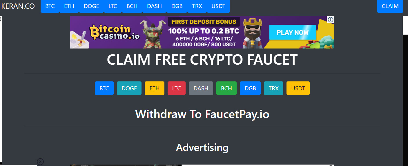 The ggi Faucet consists of 8 different cryptocurrencies: Bitcoin, Ethereum, Dogecoin, Litecoin, Bitcoin Cash, Dash, Digibyte and Tron. Each wallet address must be registered on FaucetPay to which the compensation for all claims is allocated in real time. Below we will explain how to make money with free cryptocurrencies on the Keran platform. Access the site using the link below: