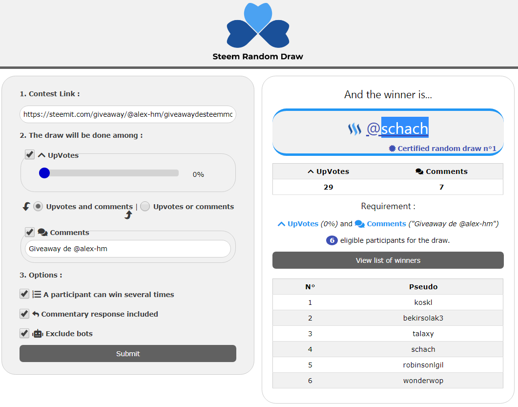 - El ganador será elegido aleatoriamente usando Steem Random Draw