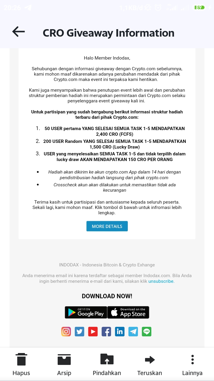 Wah, beberapa hari yang lalu saya membaca postingan dari Fanpage Facebook resmi Indodax, mereka bekerja sama dengan CRO (Crypto) memberikan giveaway kepada seluruh member Indodax. Kalau menurut pengumuman resmi indodax program ini tidak di undi, siapa yang mendaftar pada tanggal periode giveaway akan tetap mendapatkan CRO.