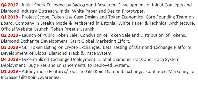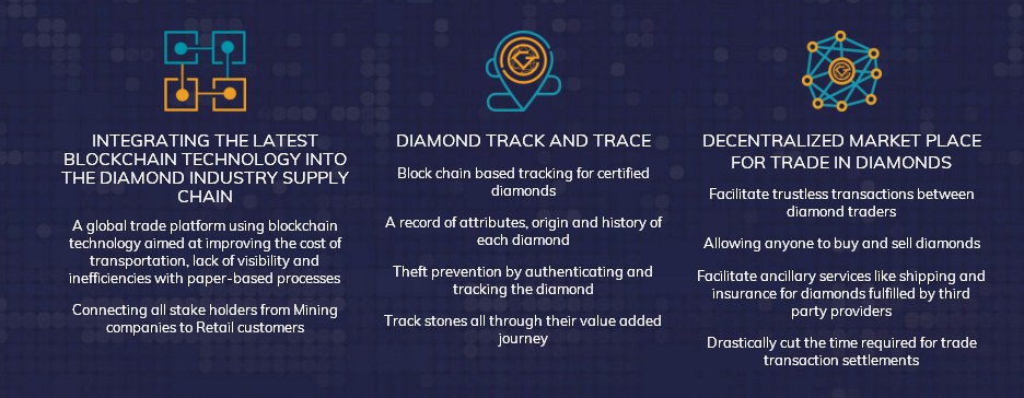 Das Projekt verwendet die neueste Technologie blockchain in die Lieferkette der Diamanten-Industrie. Dies eröffnet eine neue Plattform für den globalen Diamanten-Handel. Zusätzlich zur Verringerung der Kosten im Zusammenhang mit der Transaktion, GLITZKOIN beseitigt die Ineffizienz inhärent in der Verarbeitung der Transaktionen auf dem Papier. Eine Reihe von erweiterten Funktionen, die implementiert ist, um eine sehr komplexe und detaillierte Tracking von Diamanten. Das Ziel ist die Dezentralisierung der Diamant-Markt, die erheblich erweitern den Zugang für Käufer und Verkäufer von Diamanten. Der Diamant-Handel erfordert zusätzliche unterstützende Dienstleistungen, wie Transport, Finanzierung und Versicherung. Diese Dienstleistungen werden von den einzelnen Dienstleistern.
