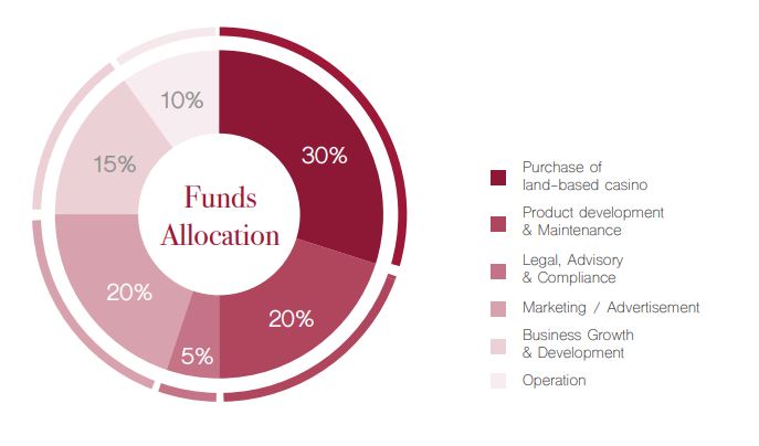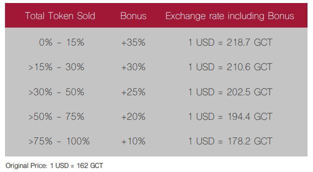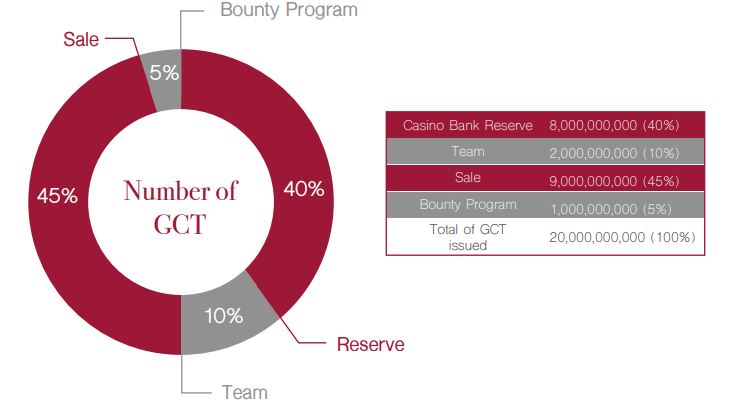 Total token issued is 20,000,000,000 GCT (100%). The largest number of tokens (45%) are in public sale and the second largest number of tokens (40%) are in the casino bank reserve.