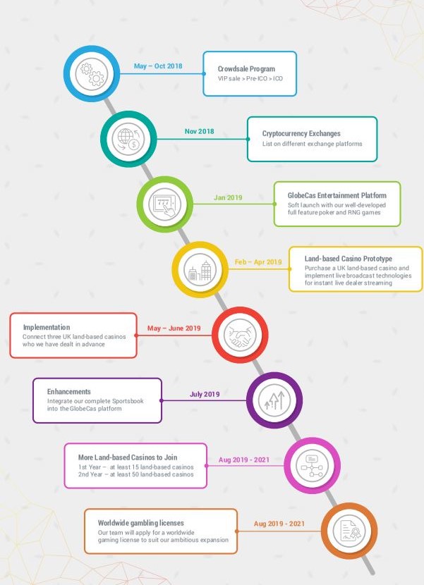 GlobeCas will completely reinvent the gambling industry by bringing together all the land-based and online casinos in the world. An integrated platform will be built to allow land-based casinos to broadcast their live dealer tables. GlobeCas was founded to connect the global casinos and the clients from different countries around the globe under one integrated platform with the same cryptocurrency. GlobeCas online casino is running with the latest technologies that are safe and secure. This model is scalable and flexible that allows GlobeCas to adjust and suit in any market with different cultures, languages or urrencies. GlobeCas will first build an online integrated platform, bring all land-based casinos channels together. Including well-developed poker games, RNG games, slot machines and sportsbook to attract more clients in the beginning.