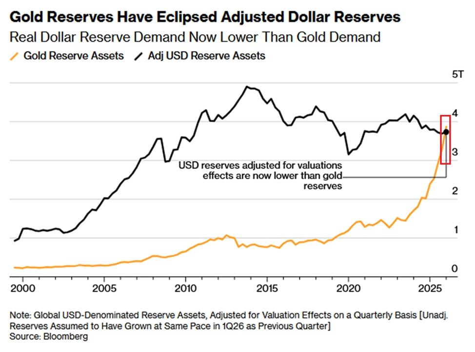 Central bank gold holdings surpassed valuation-adjusted US Dollar reserve assets for the first time on record.