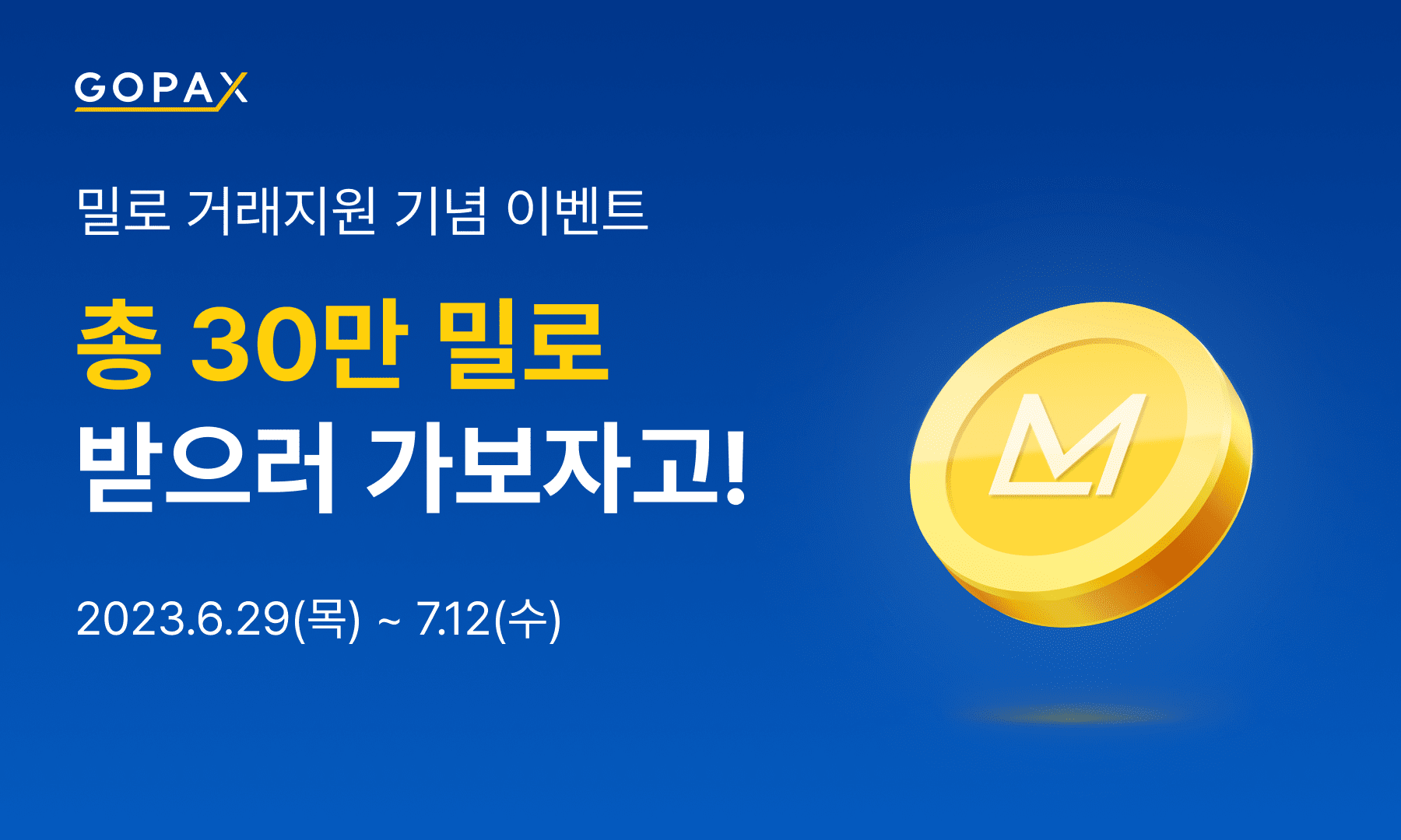 - 고팍스에서는 밀로(MILO) 거래지원을 기념하여 2023년 6월 29일부터 7월 12일까지 이벤트를 진행합니다.