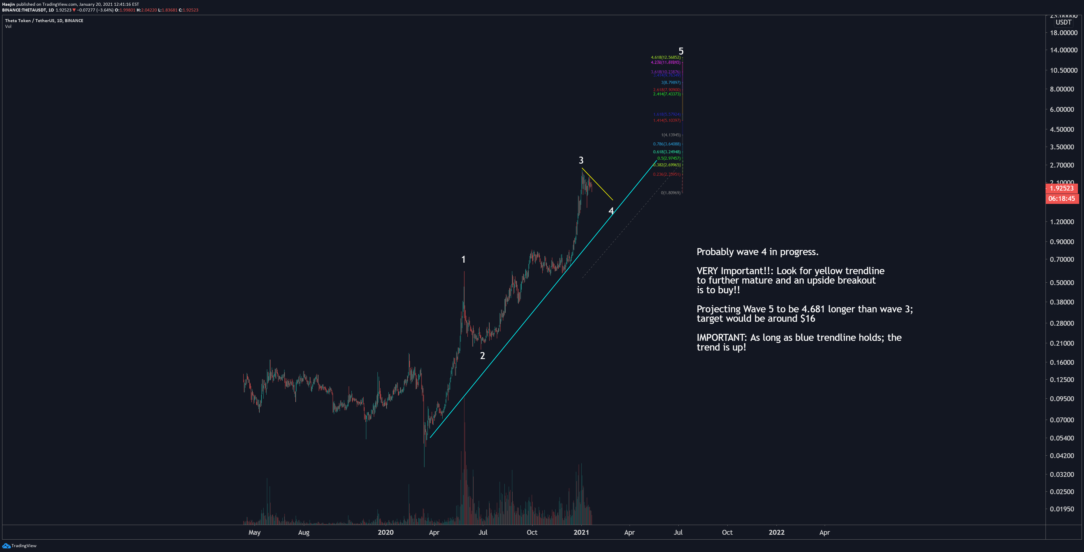 THETA Price Target #$14goulash (82)in #goulash • 5 years ago This chart shows how THETA is solidly into a strong uptrend which is to be followed; e.g. buy the dips towards the blue line!