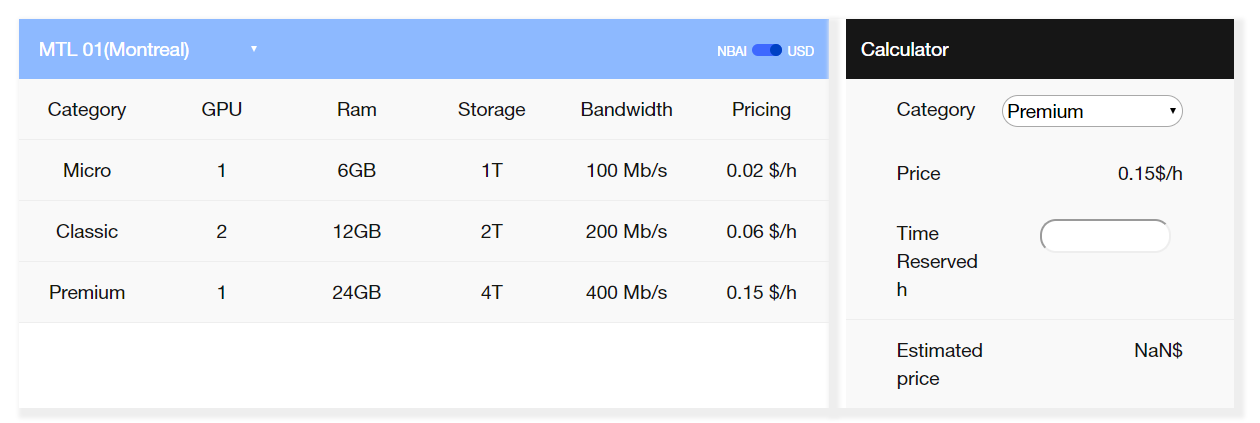 Orion Cloud price list (Users can choose to pay in USD or Nbai token)