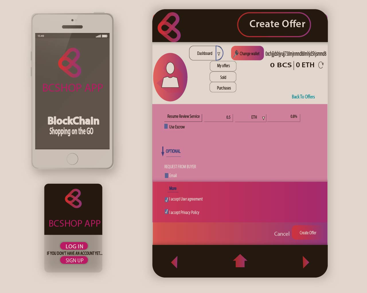 This Graphic depicts the API of the BCShop.io on the mobile device showing users that BCShop is not just a lively marketplace but also a mobile one