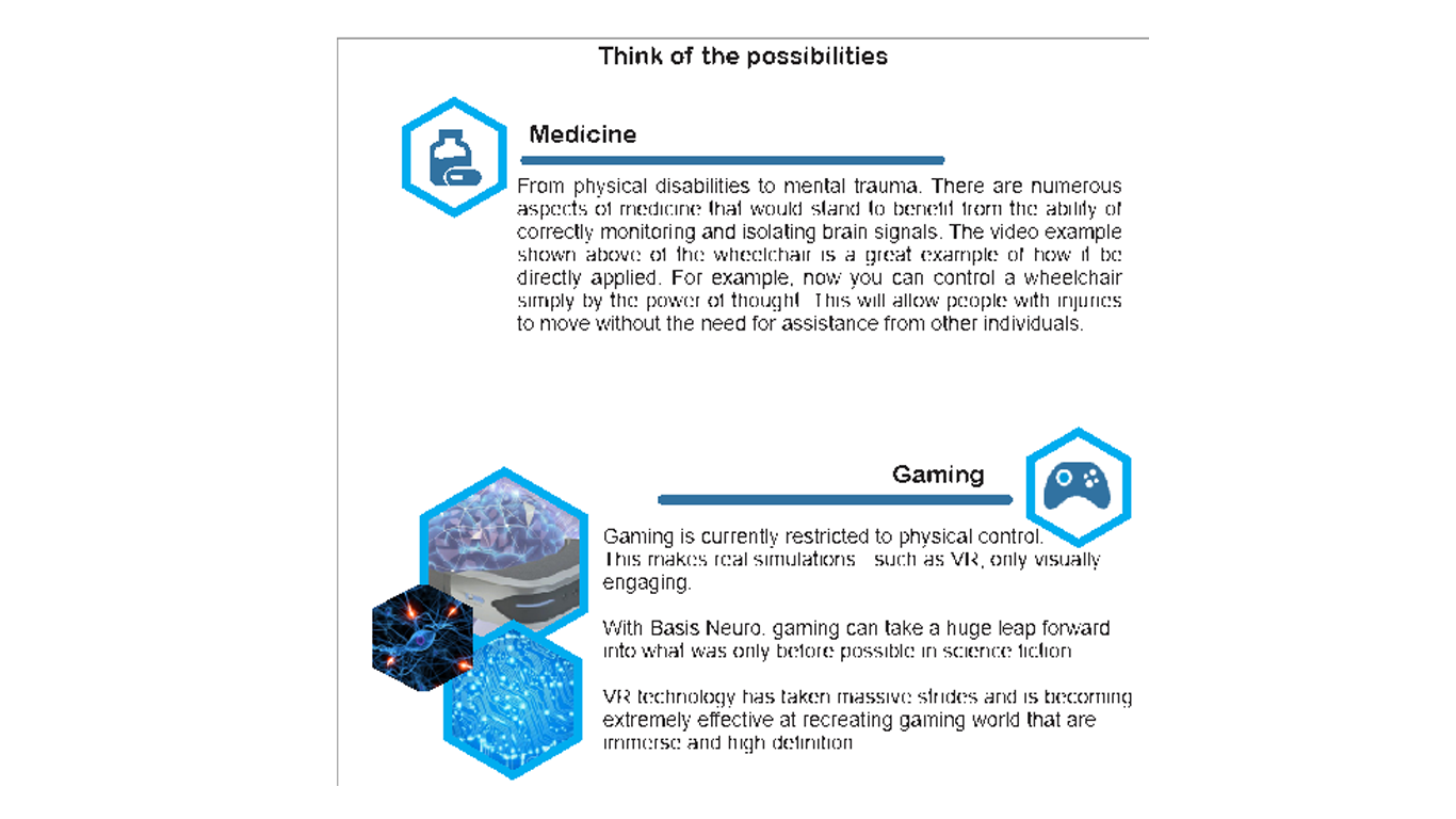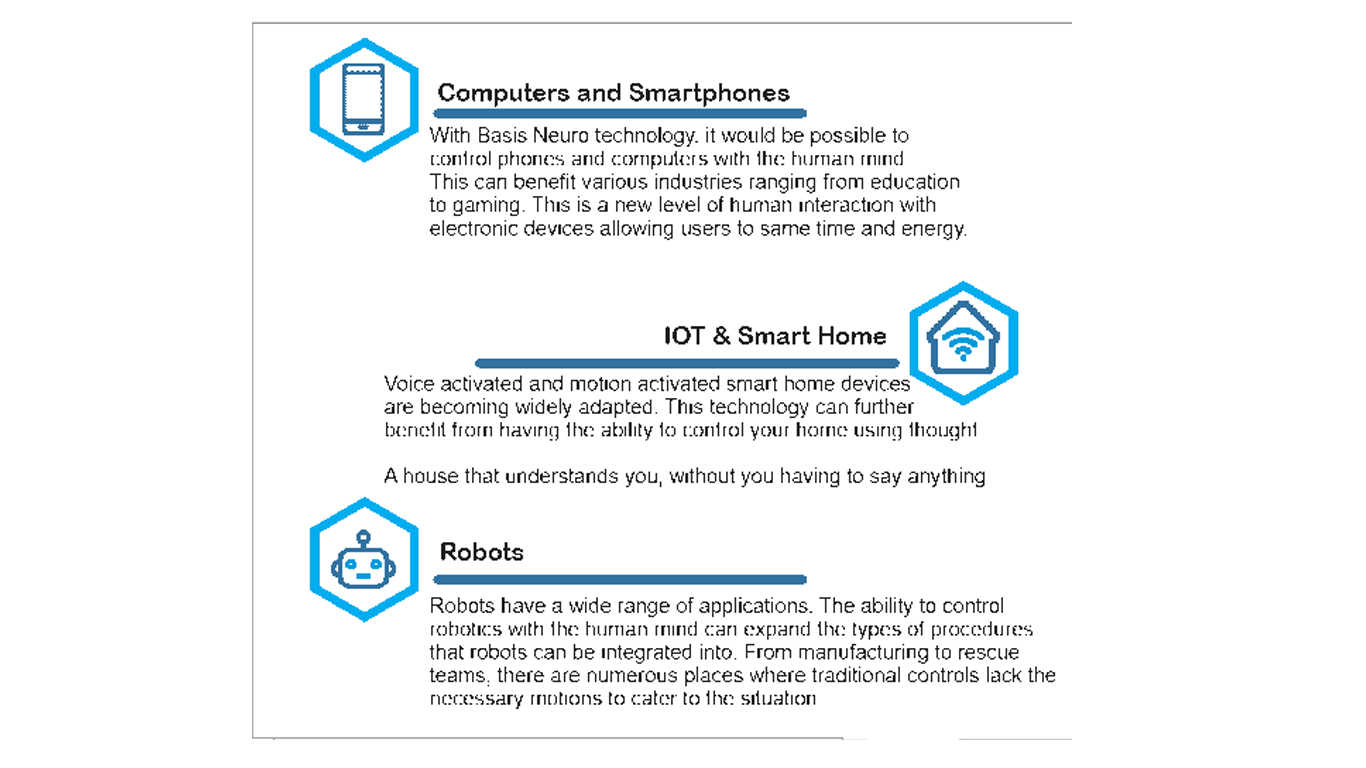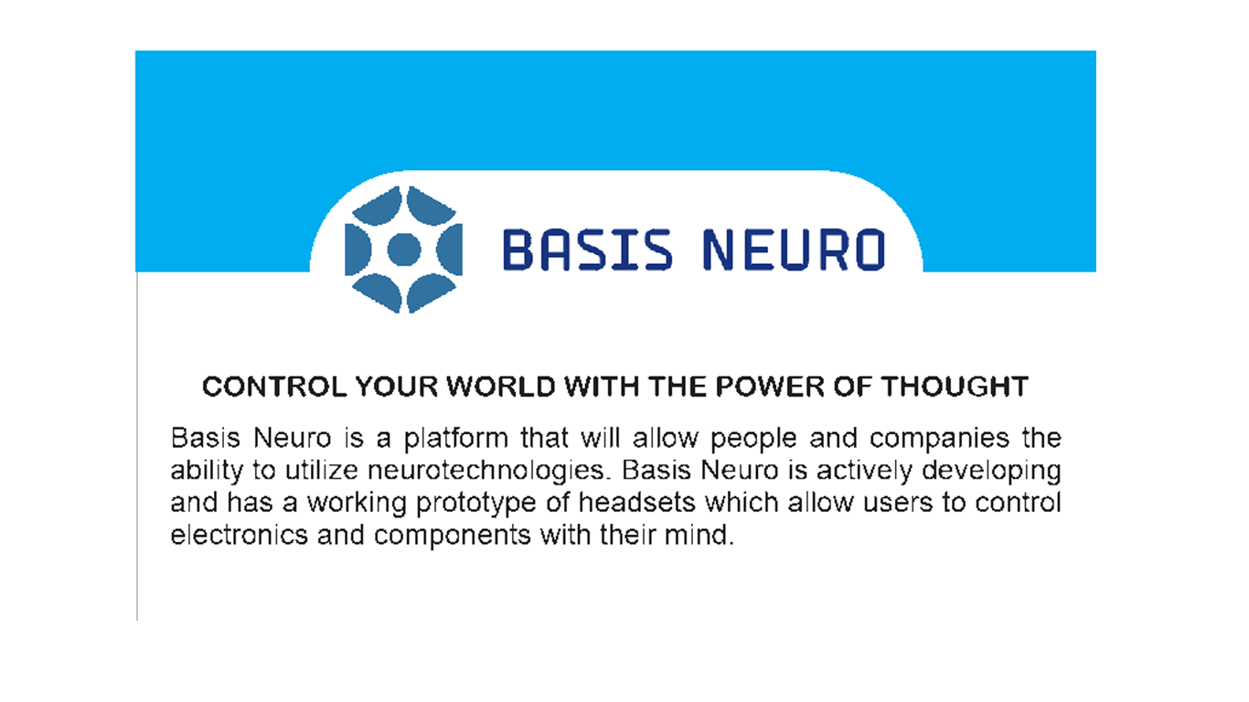 Basis Neuro is a platform that will allow people and companies the ability to utilize neurotechnologies. Basis Neuro is actively developing and has a working prototype of headsets which allow users to control electronics and components with their mind.