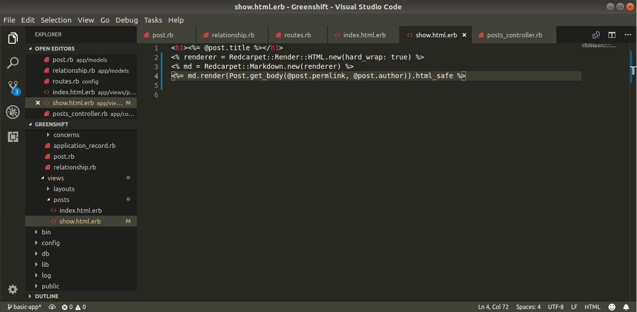 After declaring we want to roll out the Red Carpet, we run bundle install which loads any gems within the Gemfile that we currently do not have. And just like that, we have a new library to play with. And here is me playing with it in our show.html.erb file: