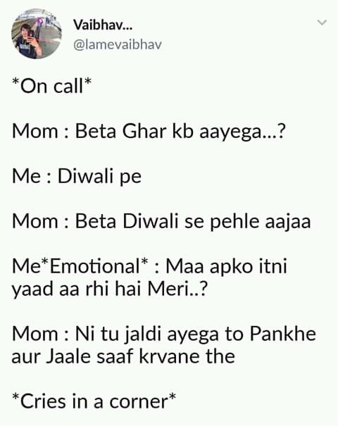 Mom: Ni tu ghar aayega to pankhe or jaale saaf karane the.