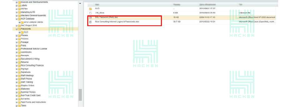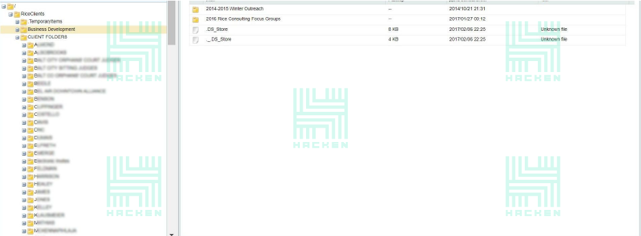 Storage contained detailed information on each of the Rice Consulting client (past, current, and potential), e-mail databases with details on thousands of fundraisers (phones, names, emails, addresses, companies), contracts, meeting notes, desktop backups, employee details, etc.