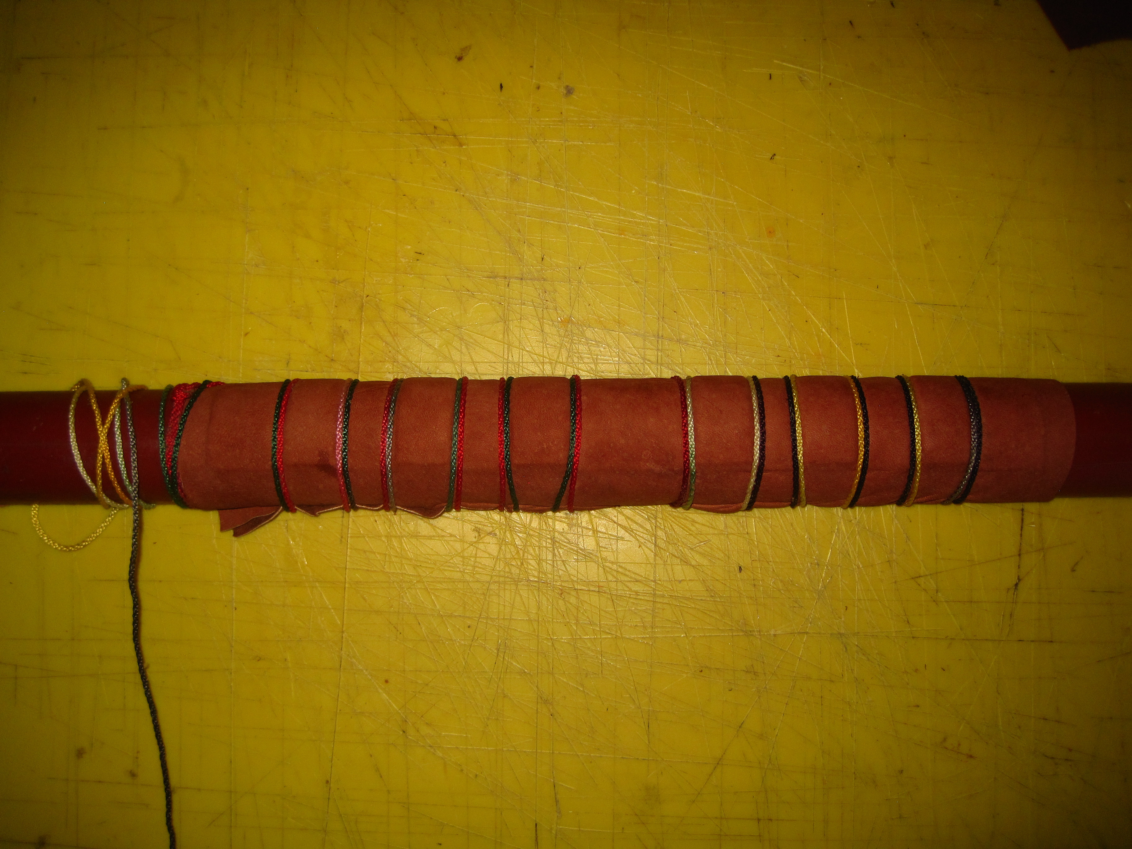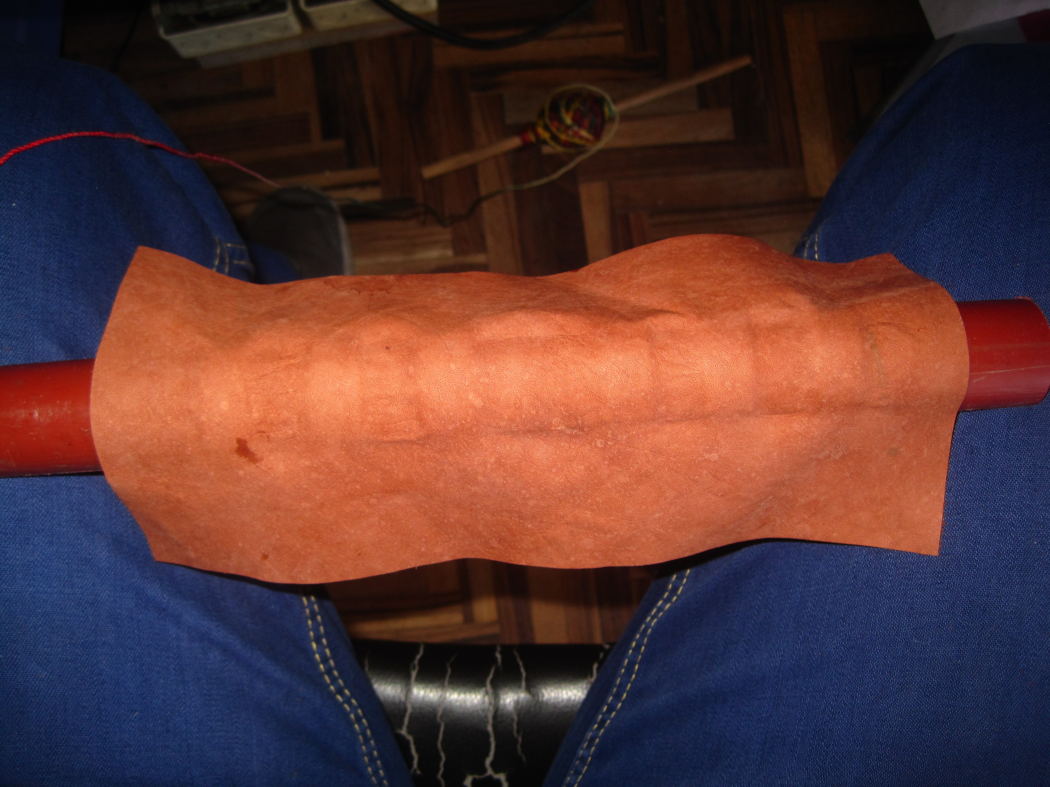 Stretching the leather on the spine, which in turn rests on a PVC tube, on my thighs: