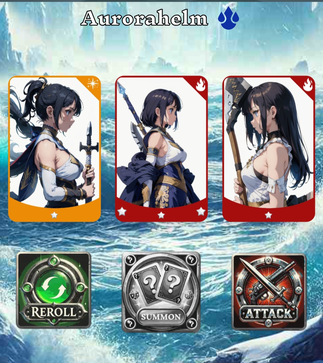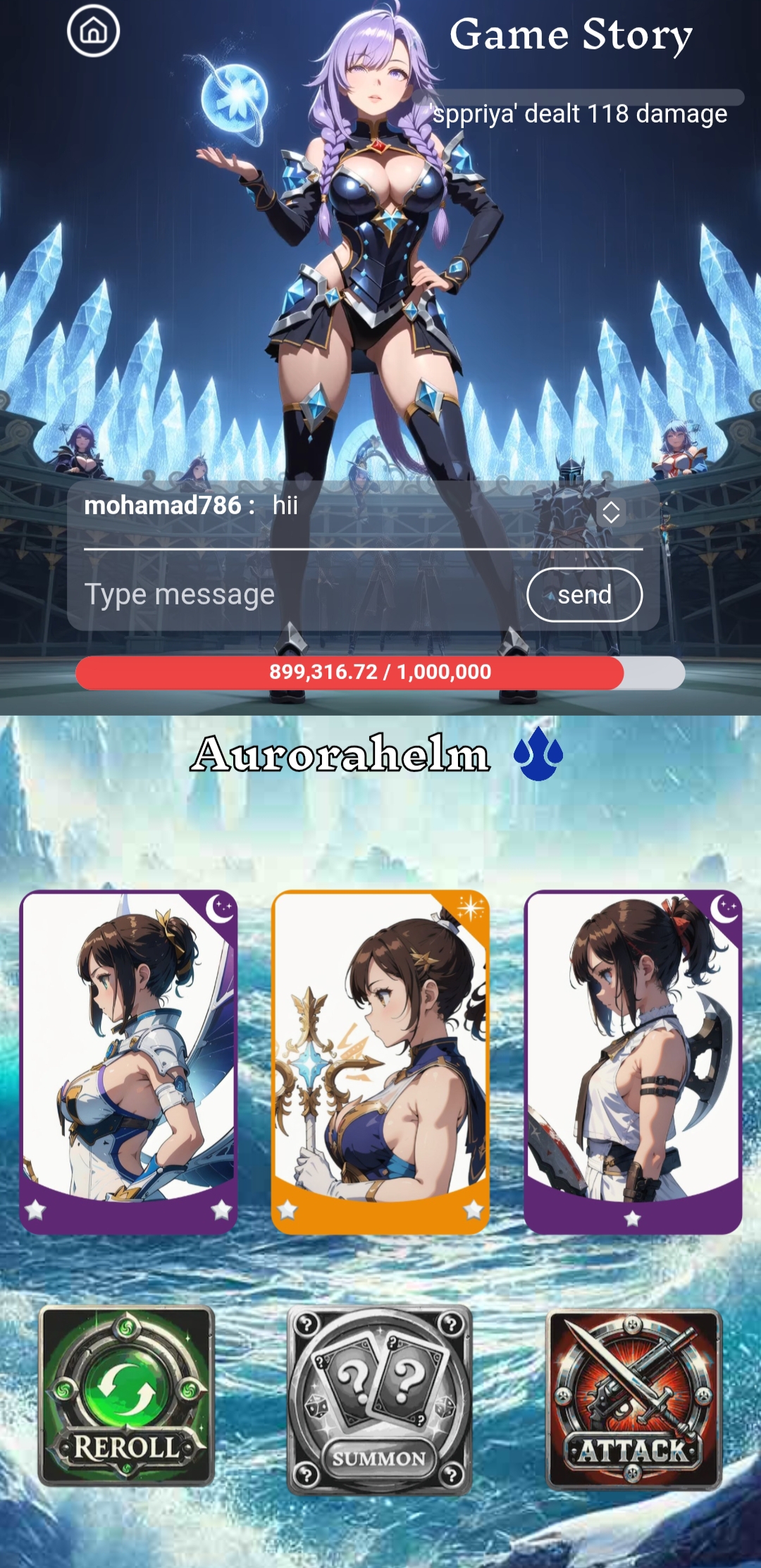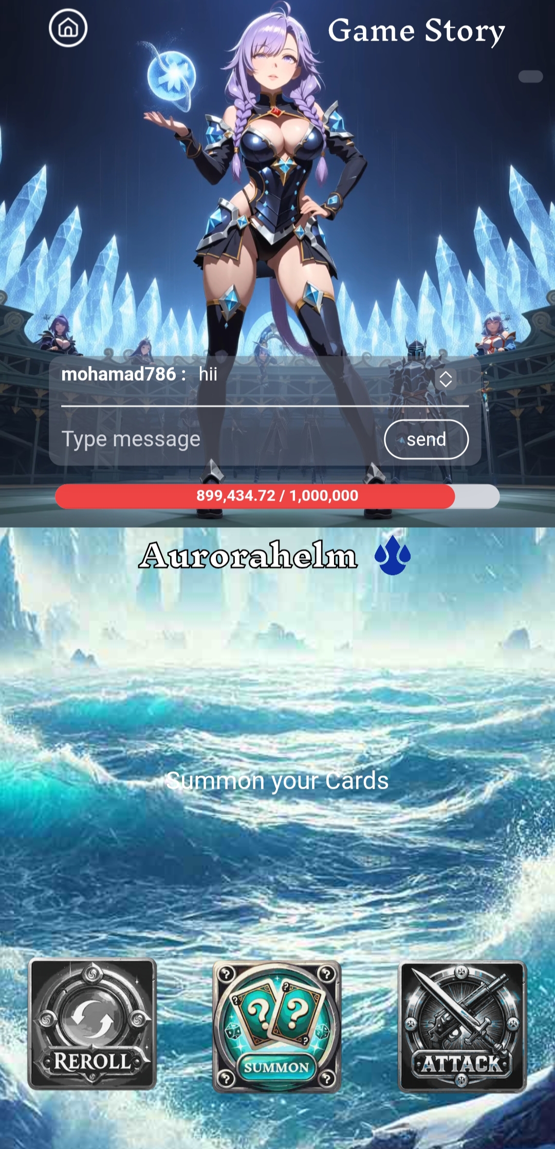 Next, I scroll down to the bottom of the interface and select the play option. As soon as I select the option, a new page appears. There, I click on the summon button and three cards are presented to me. After examining the cards, I notice an attack button on the right side and click on it to launch my attack.