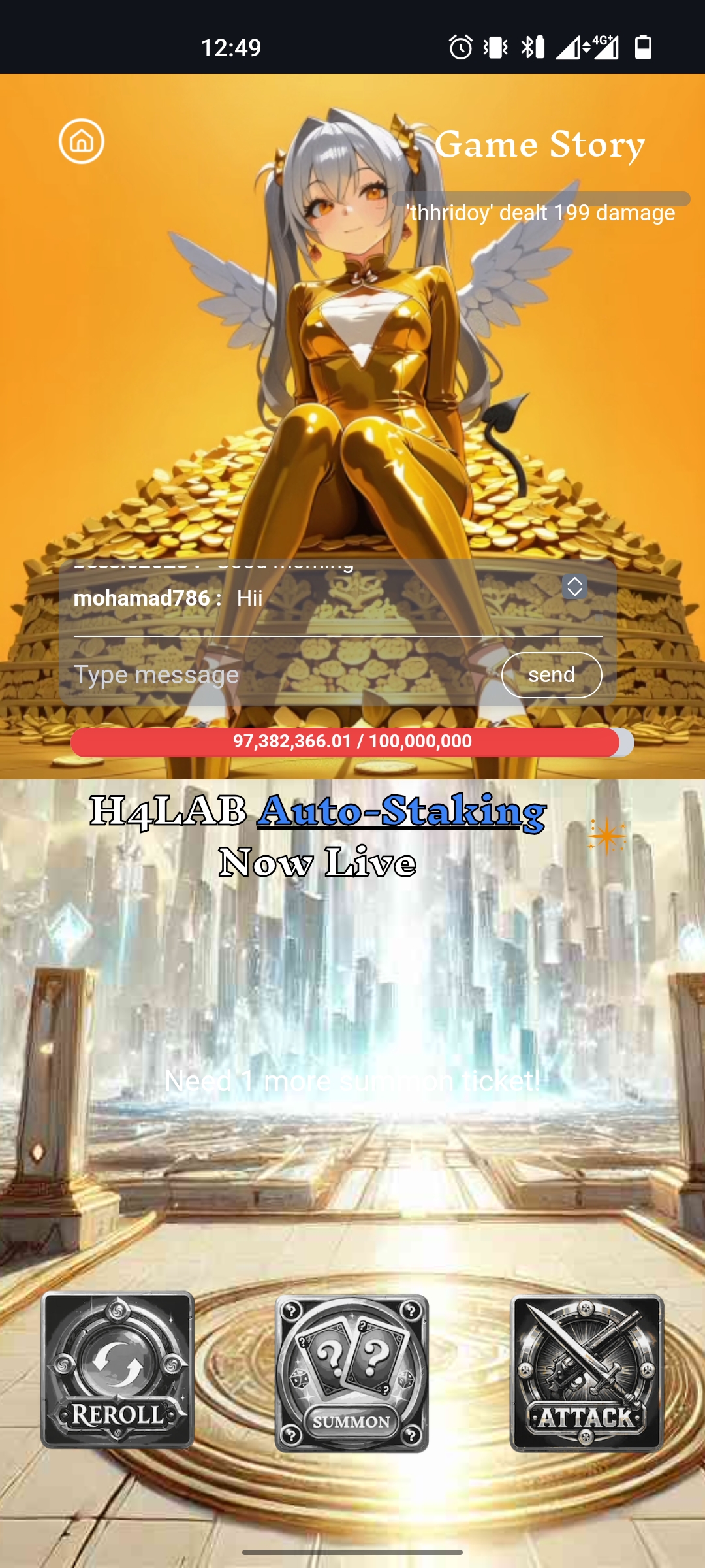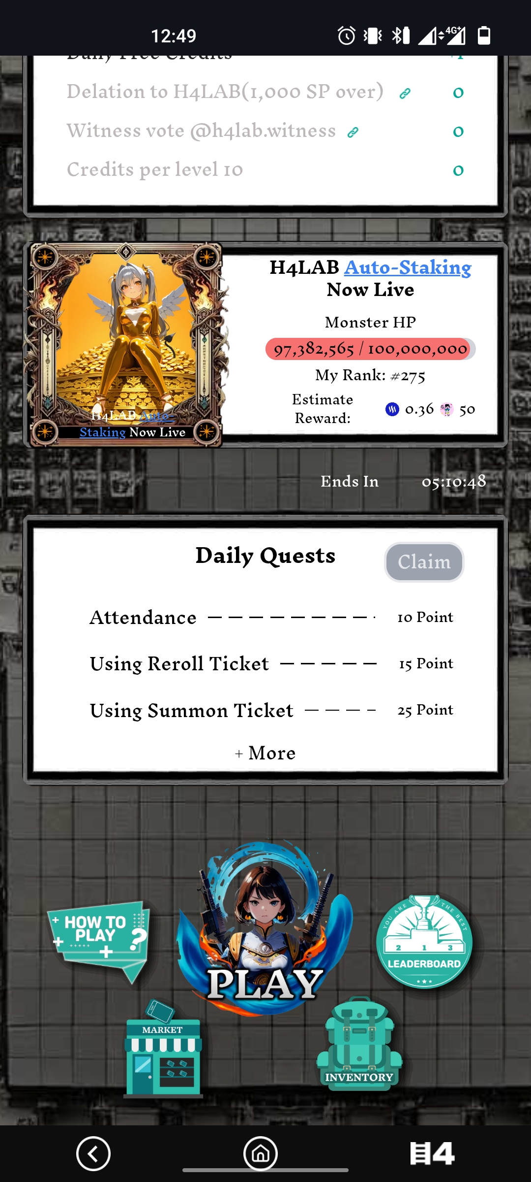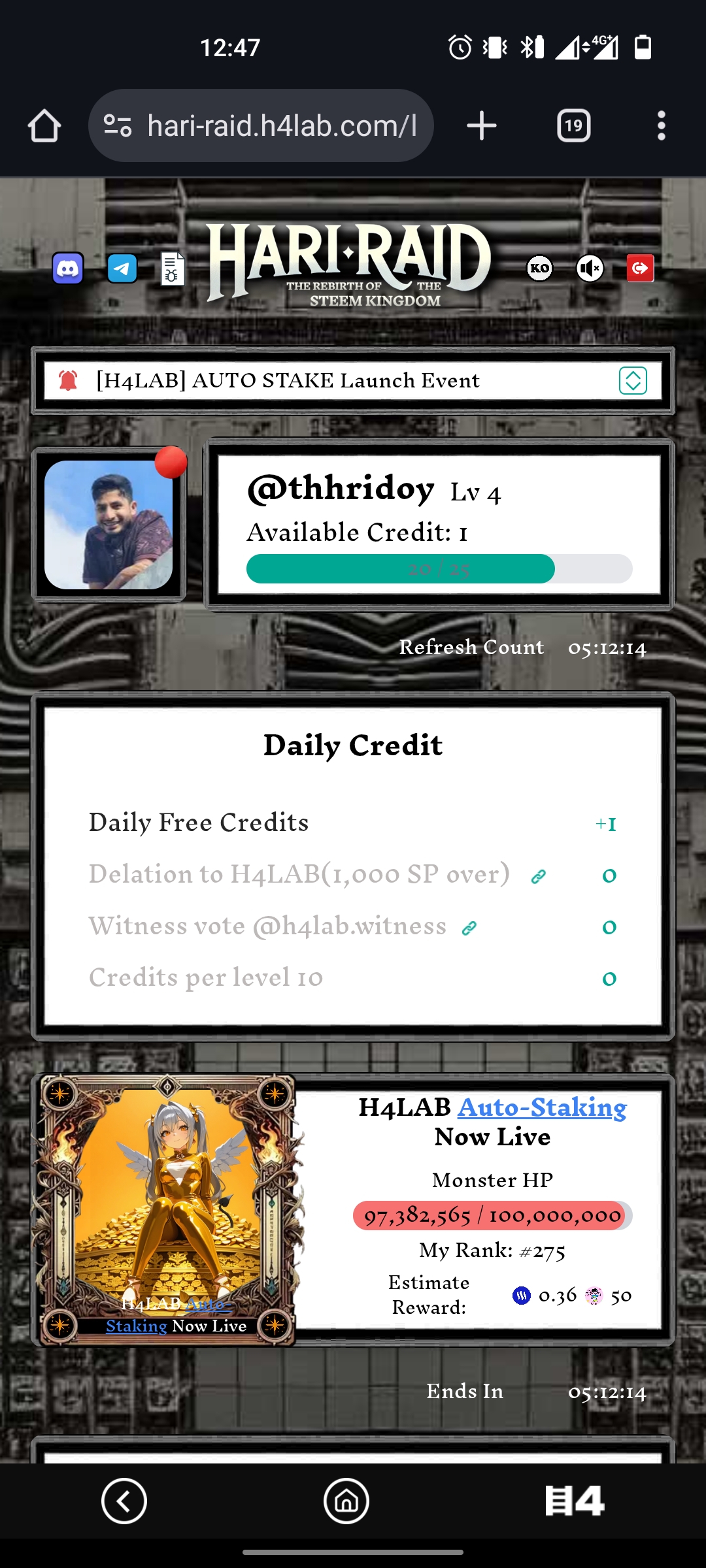 Today, the fourth day, I brought you again the experience of playing the Hari Raid game on the Steemit platform. It is actually a wonderful game. Everyone who plays it knows the fun of this game. The power of the monster is 97382364. I said in the previous balls that this monster has a lot of power. It will take a long time to finish it. Today, my level was 4. My credit was 1.