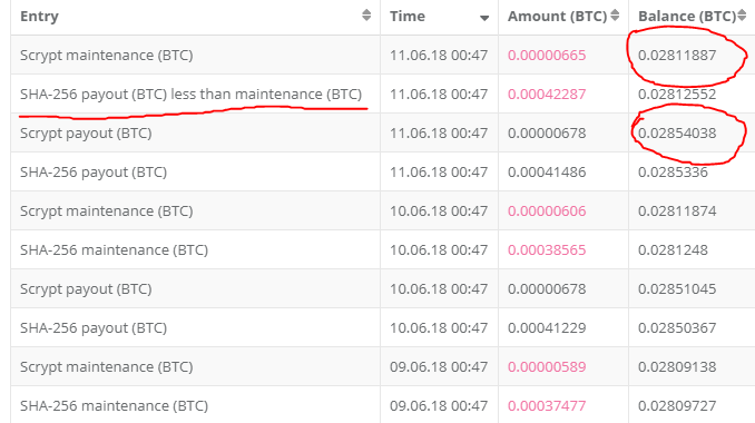 The image below shows a Hashflare wallet that has a higher balance before the last payout. The circled amounts show the maintenance fee being taken from your own balance. This is the first day the maintenance fee has been higher than the payout so many people aren't aware yet. If you have just over 0.03 BTC and are able to withdraw, I would do so now before your balance becomes unable to withdraw.