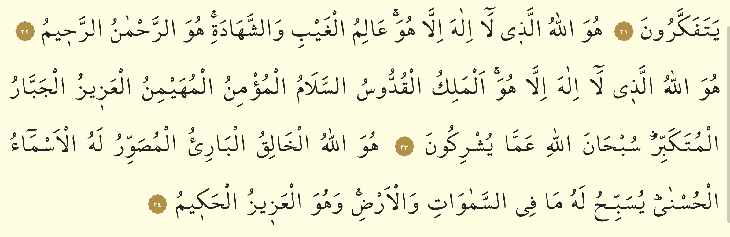 O, kendisinden başka hiçbir ilah olmayan Allah'tır. Gaybı da, görünen âlemi de bilendir. O, Rahmân'dır, Rahîm'dir. ﴾22﴿ O, kendisinden başka hiçbir ilah bulunmayan Allah'tır. O, mülkün gerçek sahibi, kutsal (her türlü eksiklikten uzak), barış ve esenliğin kaynağı, güvenlik veren, gözetip koruyan, mutlak güç sahibi, düzeltip ıslah eden ve dilediğini yaptıran ve büyüklükte eşsiz olan Allah'tır. Allah, onların ortak koştuklarından uzaktır. ﴾23﴿ O, yaratan, yoktan var eden, şekil veren Allah'tır. Güzel isimler O'nundur. Göklerdeki ve yerdeki her şey O'nu tesbih eder. O, mutlak güç sahibidir, hüküm ve hikmet sahibidir. ﴾24﴿