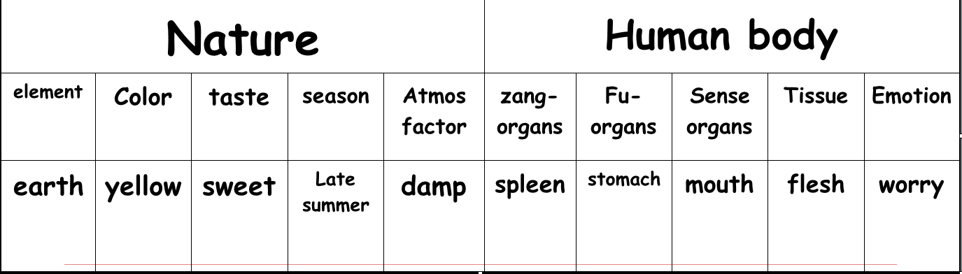 The spleen corresponds to earth because it govern transformation and transportation the food and water, produce qi and blood for whole body, just like the earth produce the food and water for us. Earth produce mature food which is yellow in color and very sweet in taste. So yellow and sweet correspond to earth. Late summer is the middle of the seasons, like the earth is in the middle of five elements. And the weather in late summer is rainy. So late summer and moist belong to earth. The mouth and flesh all belong to earth, because the condition of the spleen can be reflected in the mouth, and the spleen controls the flesh though the meridians.Worry is easy to impair the spleen-qi, leading to clinical manifestations such as poor appetite, loose stool. Therefore, among the various emotions, worry is related to earth.