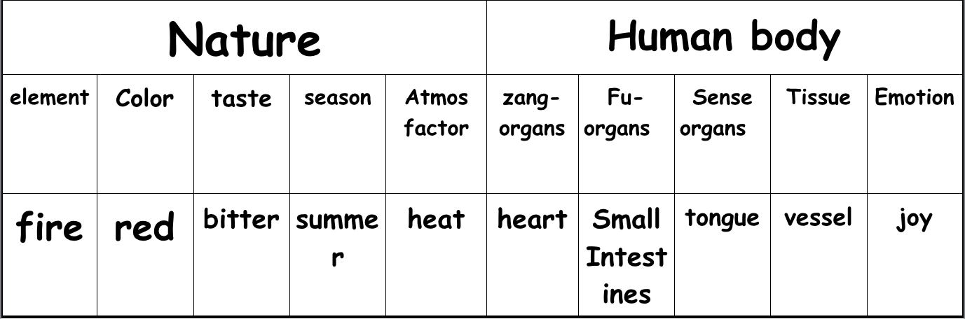 The heart corresponds to fire because it circulates blood which carrying energy to the whole body , like fire produce warmth. Fire has red flame, so red corresponds to fire. The burned food tastes little bitter, and bitterness is related to fire. Fire is hot, and the weather in summer is hot. Summer is the season belonging to fire.The tongue and vessel all belong to fire, because the condition of the heart can be reflected in the tongue, and the heart controls the vessel though the meridians. Over-joy is easy to impair the heart-spirit, leading to clinical manifestations such as mental disorder, trouble sleep. Therefore, among the various emotions, joy is related to fire.
