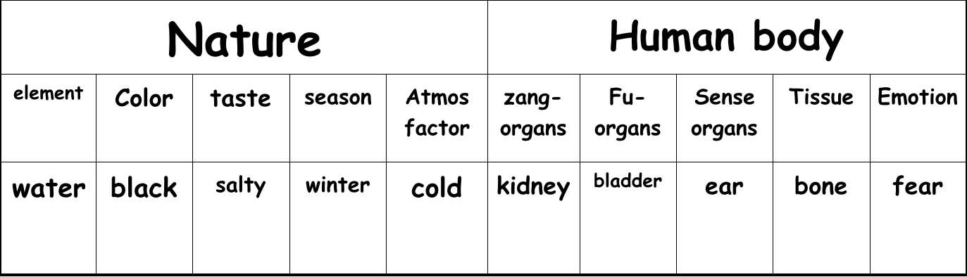 The kidney corresponds to water because it stores essence and governs water of the whole body. Water is cold, and winter is cold too. So cold and winter correspond to water. Sea is salty, so salty in taste belong to water. Dark surfaces absorb energy, Sea keep most energy in our planet. So dark pertains to water. The ear and bone all belong to water, because the condition of the kidneys can be reflected in the ears, and the kidneys control the bone though the meridians. Fear is easy to impair the kidney-qi, leading to clinical manifestations such as frequent urination, more sweating. Therefore, among the various emotions, fear is related to water.