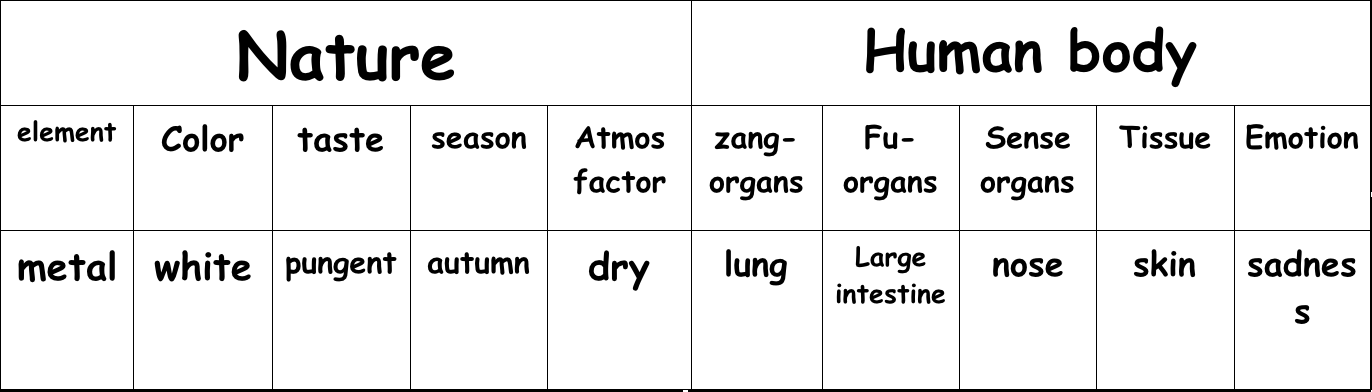 The lung corresponds to metal because it inhale the air and killing foreign matters by sneeze, like the metal is often cutting. Metal can kill everything, and when autumn comes, everything dies, nothing leaves behind. As we know, White in color reflect every ray, no ray leaves behind. So autumn and white correspond to metal.The nose and skin all belong to metal, because the condition of the lungs can be reflected in the nose, and the lungs controls the skin though the meridians. Sadness is easy to impair the lung-qi, leading to clinical manifestations such as short of breath, asthma. Therefore, among the various emotions, sadness is related to metal.