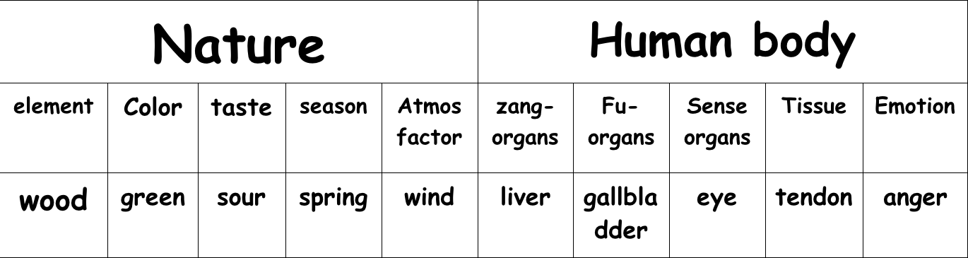 The liver corresponds to wood , because it promotes the spreading of qi and blood like the tree spreading out freely in Traditional Chinese medicine. Trees produce green leaves, so green corresponds to wood. Immature fruit, green in color is usually sour, and sourness is related to wood. Trees grow in spring, and the weather in spring is often windy. So spring is the season belonging to wood. The eyes and tendons all belong to wood, because the condition of the liver can be reflected in the eyes, and the liver controls the tendons though the meridians(we will discuss meridians in an upcoming post). Anger is easy to impair the liver, and patients with liver troubles are usually bad tempered. Therefore, among the various emotions, anger is classified into the category of wood.