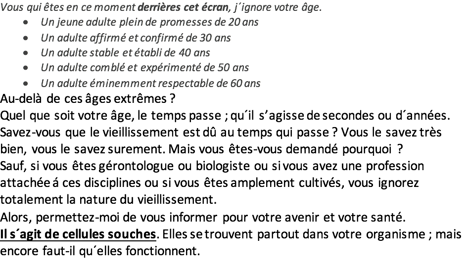 Mon rôle et ma mission est de vous indiquer comment et pourquoi faire bouger et naviguer ces cellules souches dans tout votre organisme pour arrêter de vieillir ou tout au moins ralentir le vieillissement.