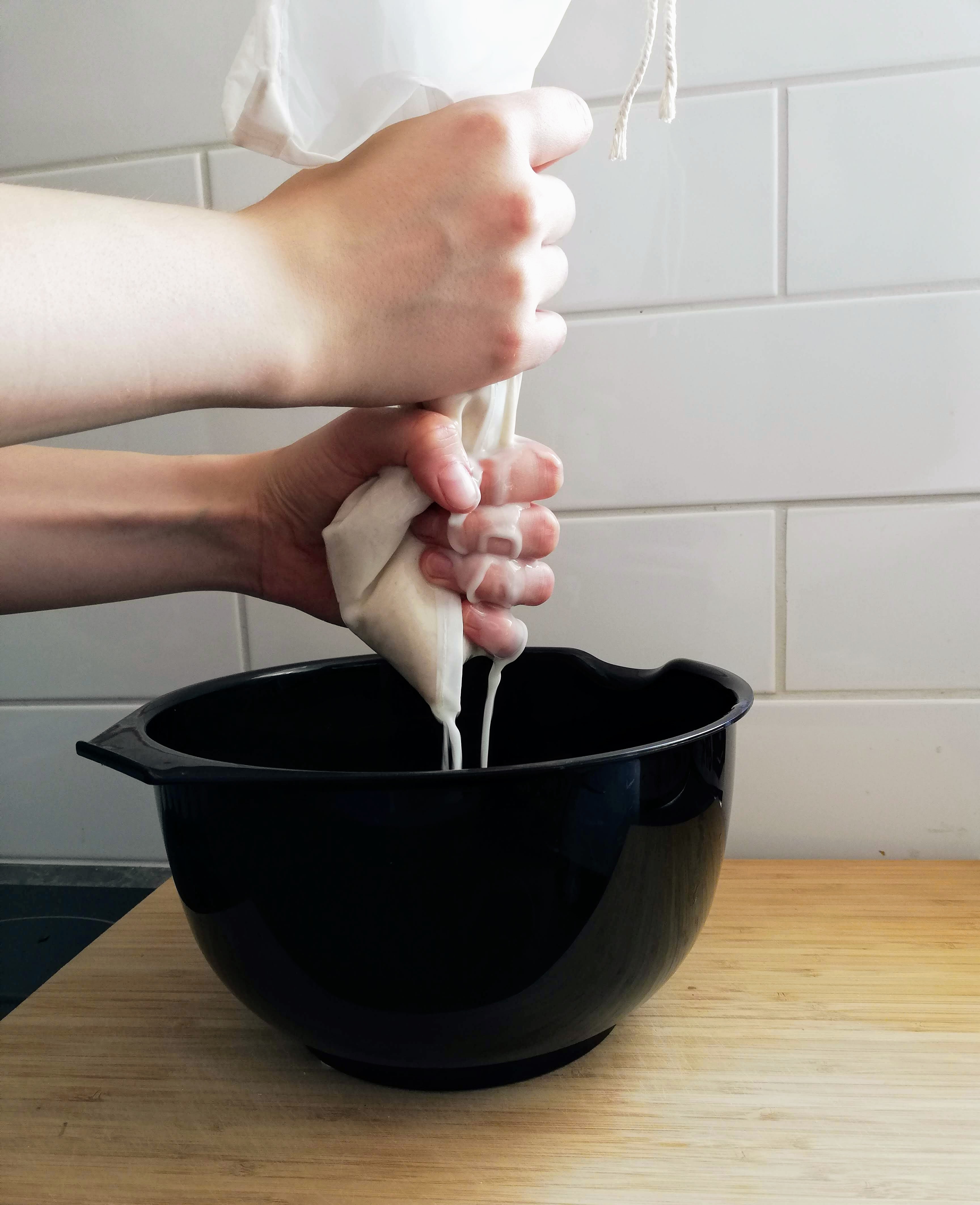 4. Take a bowl, and place the nutbag/tablecloth in it. Pour the oat milk thought the fabric, so that your final milk won’t have any pulp in it. Squeeze the bag/cloth so that you get every drop of the milk.