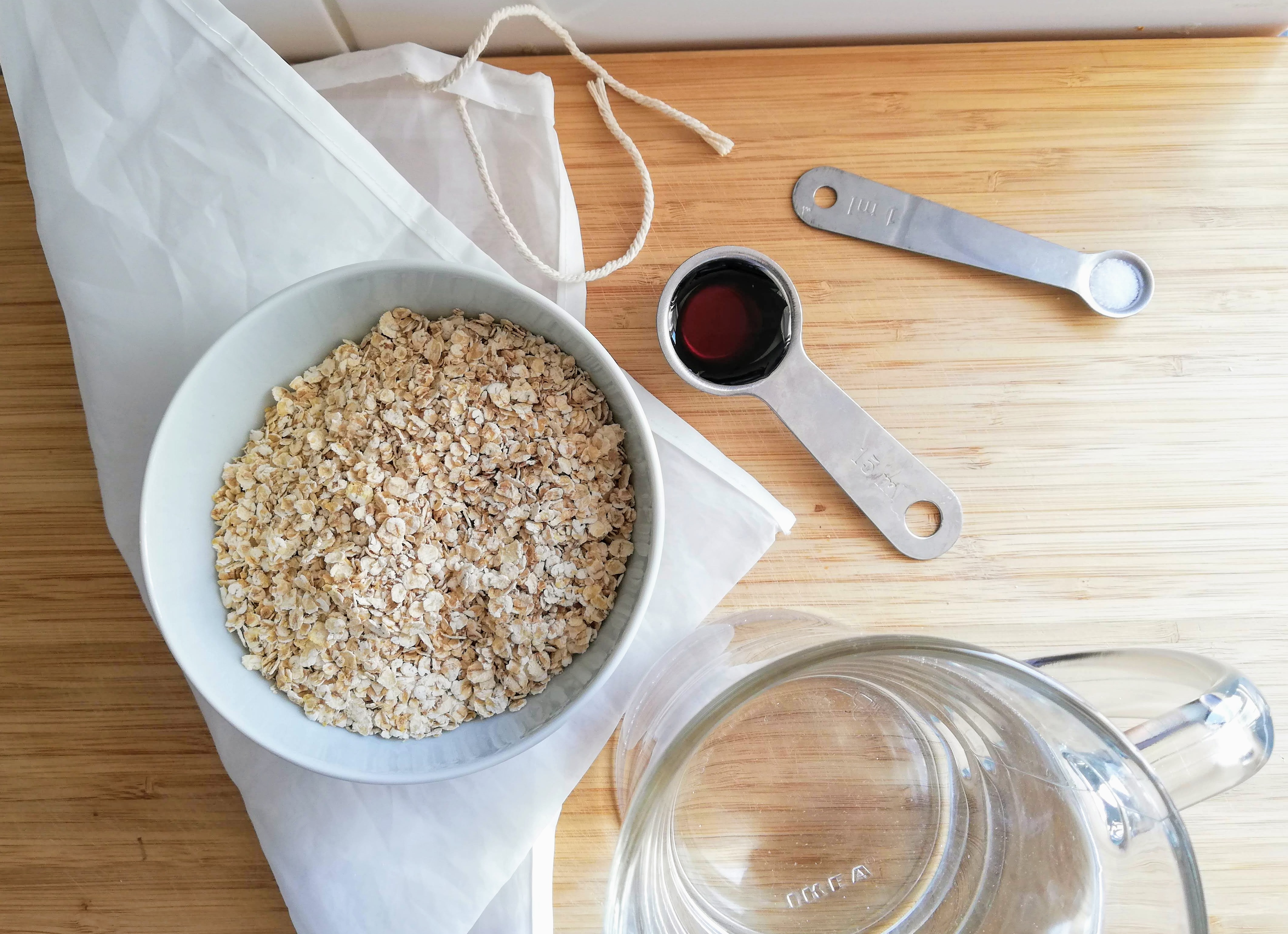 All you need is a blender, a bowl, a nutbag/tablecloth, a bottle, water, oats, a pinch of salt and a sweetener of choice, at least maple syrup or dates will work excellently!
