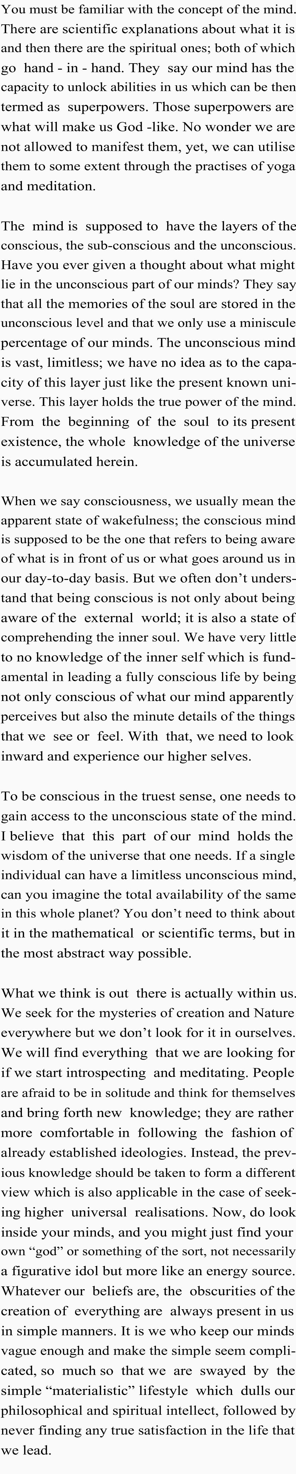 Good post.. It gives an idea to discover the power of subconscious and unconconcious parts of our mind....our conscious mind is just only 10-20% of our total mind.