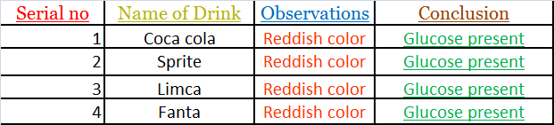 • Fonnation of reddish color confirms the presence of glucose in cold drinks.