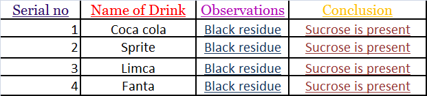 • Black colored residue left confirms the presence of sucrose in cold drinks.