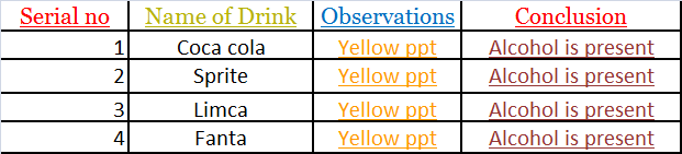 Then the test tube are heated in hot water bath for 30 minutes yellow colored precipitate confirmed the presence of alcohol in cold drinks