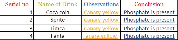 Sample of each brand of cold drink was taken in a separate test tube and ammonium molybdate followed by concentrated nitric acid (HNO3) was added to it.
