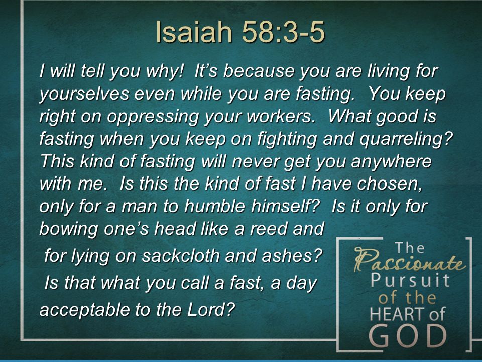 And the common thread connecting the two (fasting and praying) run all through many instances of prayer and fasting recorded in Scripture. In The Old Testament, it seems fasting with prayer was with a sense of need and dependence, a display of abject helplessness in the face of impending doom or anticipated calamity. But also using in times of mourning, repentance and spiritual refreshing. Back then they was putting on Sackloth and Ashes, they wanted to break of the chains of unrighteousness... (Jeremiah 6,26).