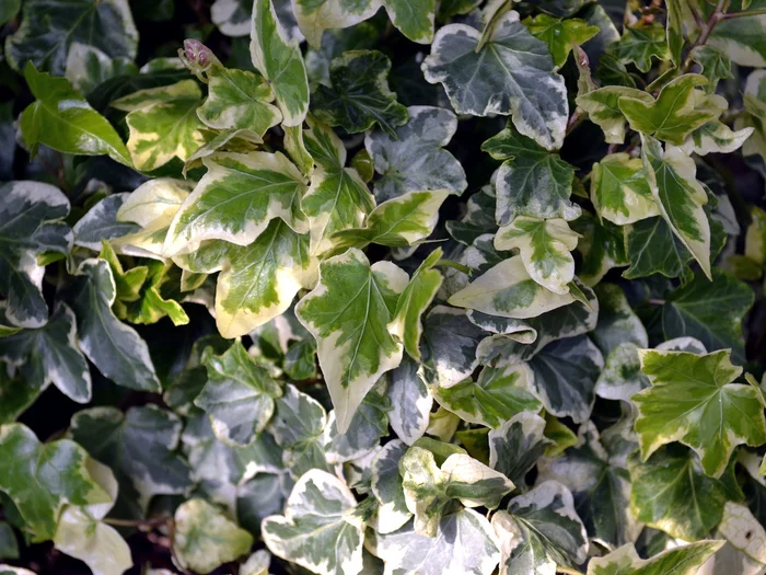 The leaves may me crinkled as with the variety 'Curlilocks', or variegated types like 'California gold' (yellow, gold, and green) or Hedera helix 'discolor' (green and creamy white).