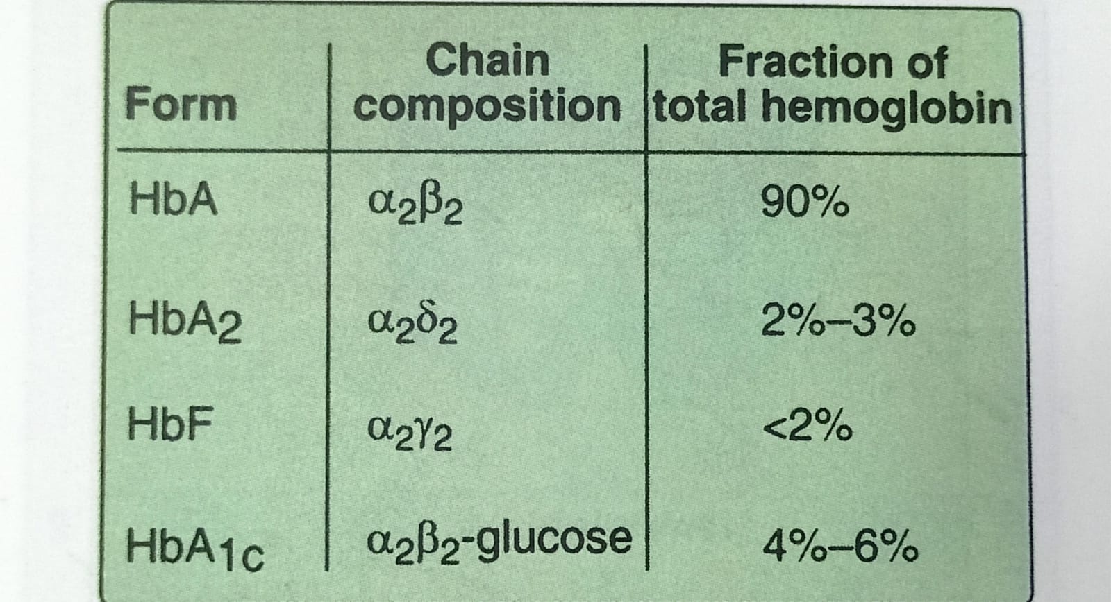 Hemoglobin A2 (HbA2): Contains two alpha and two delta chains, found in small quantities in adult blood.