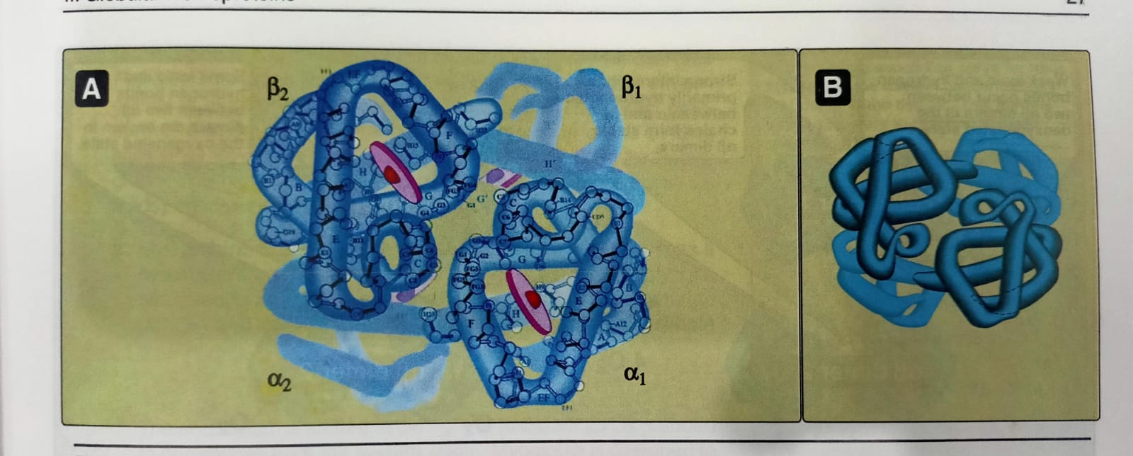 Hemoglobin is a crucial protein found inside erythrocytes (red blood cells) composed of globin chains and the heme group. The heme part consists of protoporphyrin and iron, while the globin part is made up of four polypeptide chains—two alpha chains and two beta chains—with a heme group in the center containing a ferrous iron atom capable of binding oxygen molecules.