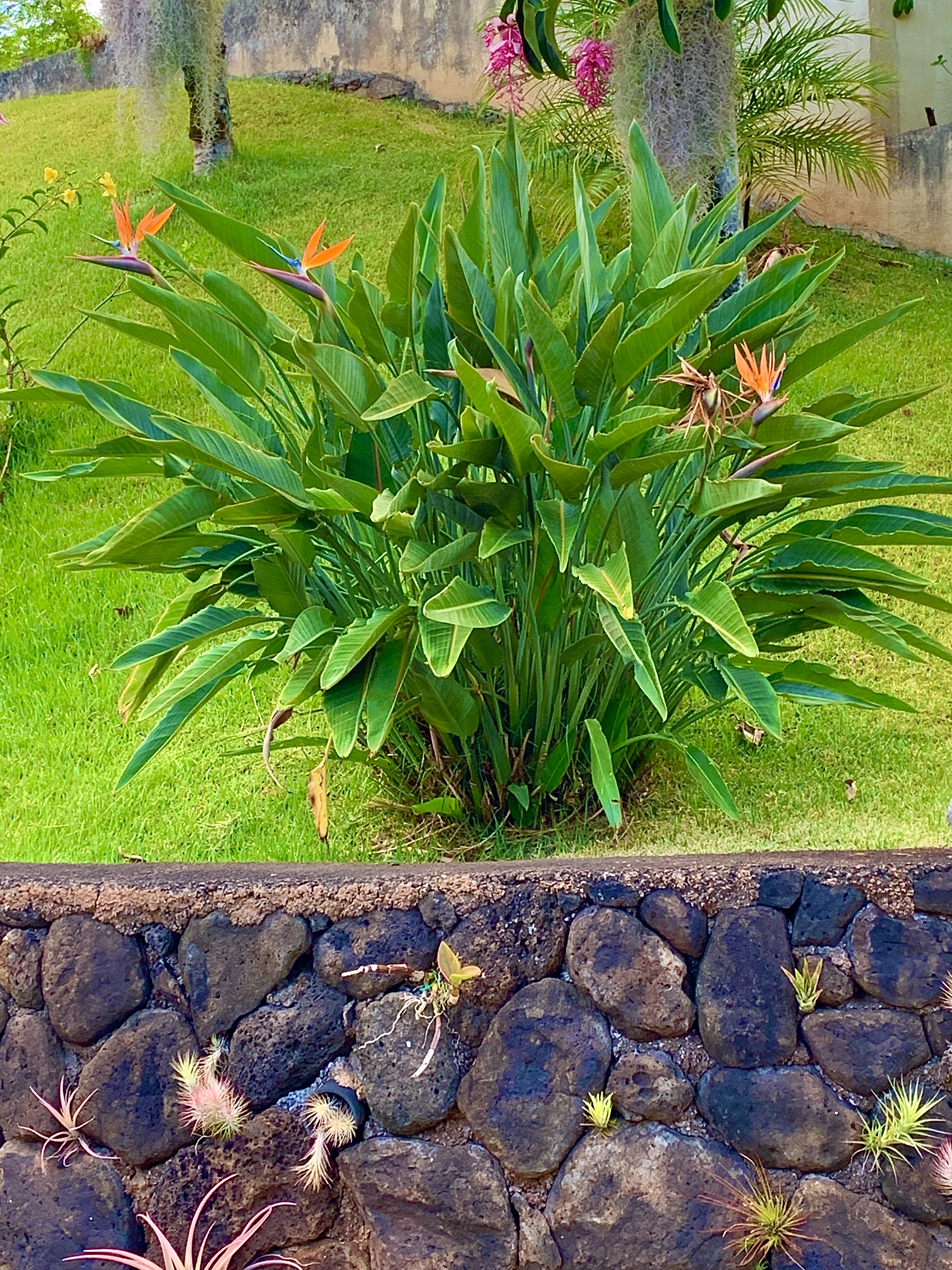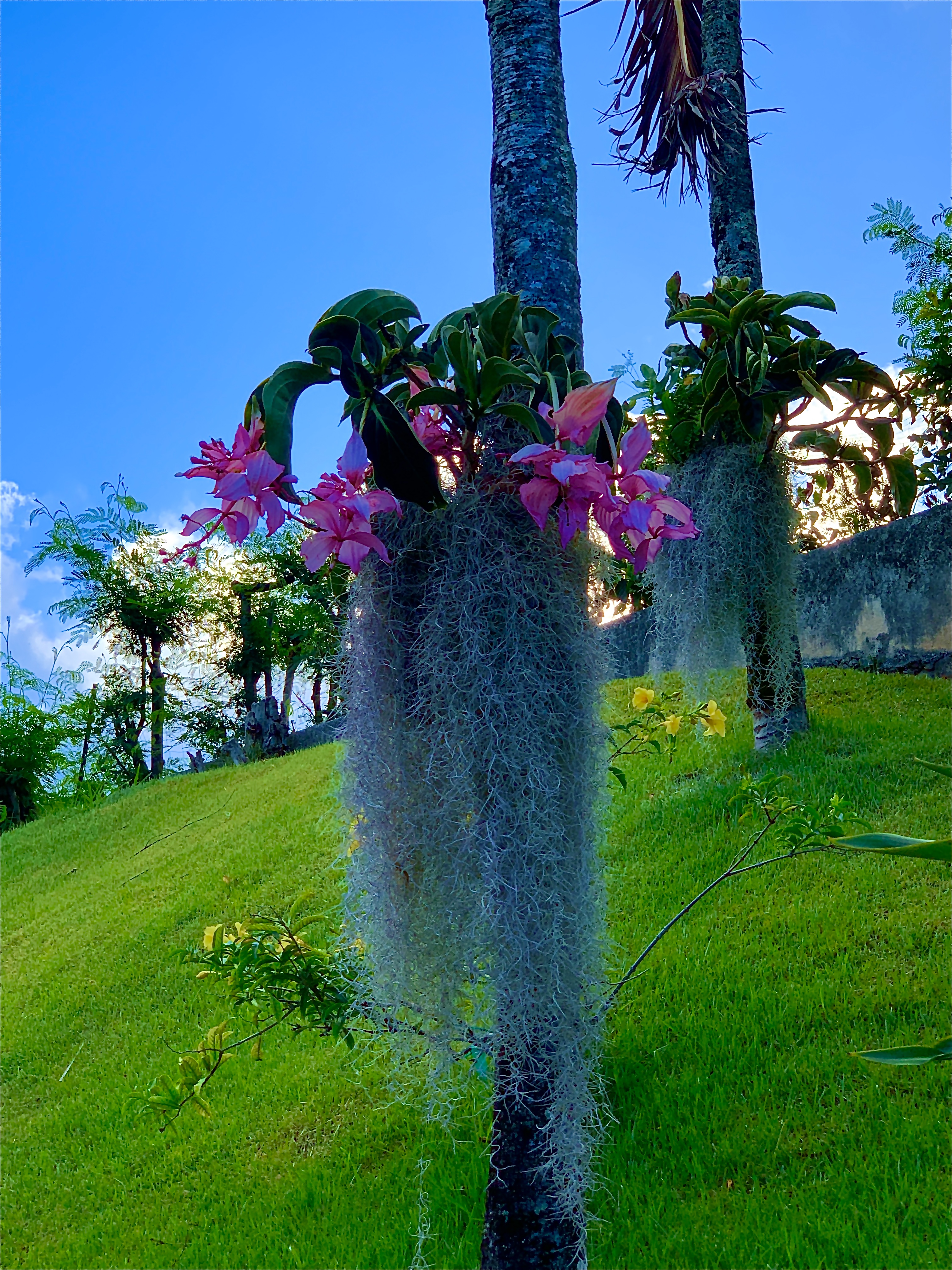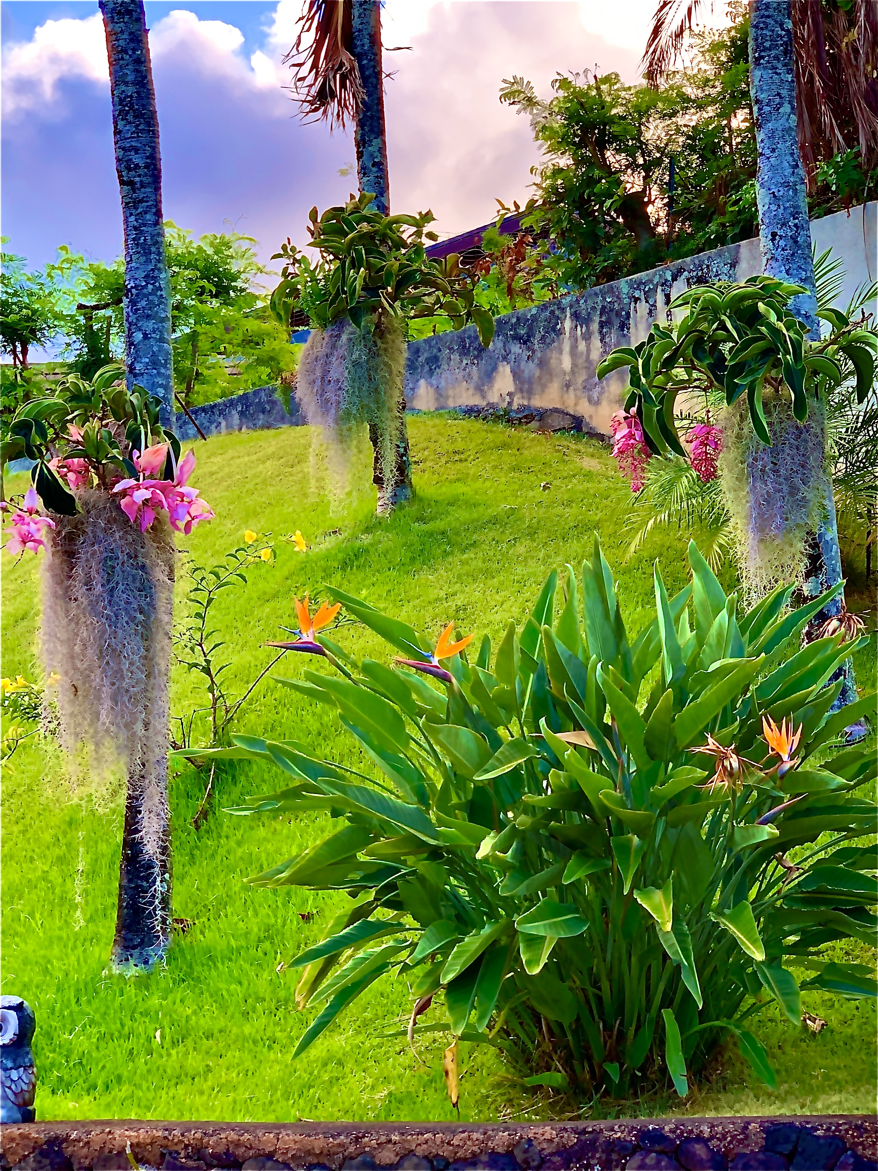 The garden shows Filipino Tree Orchids, pink flowers with bright pink berries and huge gree leaves. They require a lot of rain. I think they are native to rain forests. Also bright orange Bird of Paradise with blue trim. A beautiful flower which looks like a bird emerging from a bush, it is found in Hawaii, hence the name. Also I have planted yellow ground orchids. They love rain, sunshine and cool weather. I live on a low mountain, so they are quite happy here.