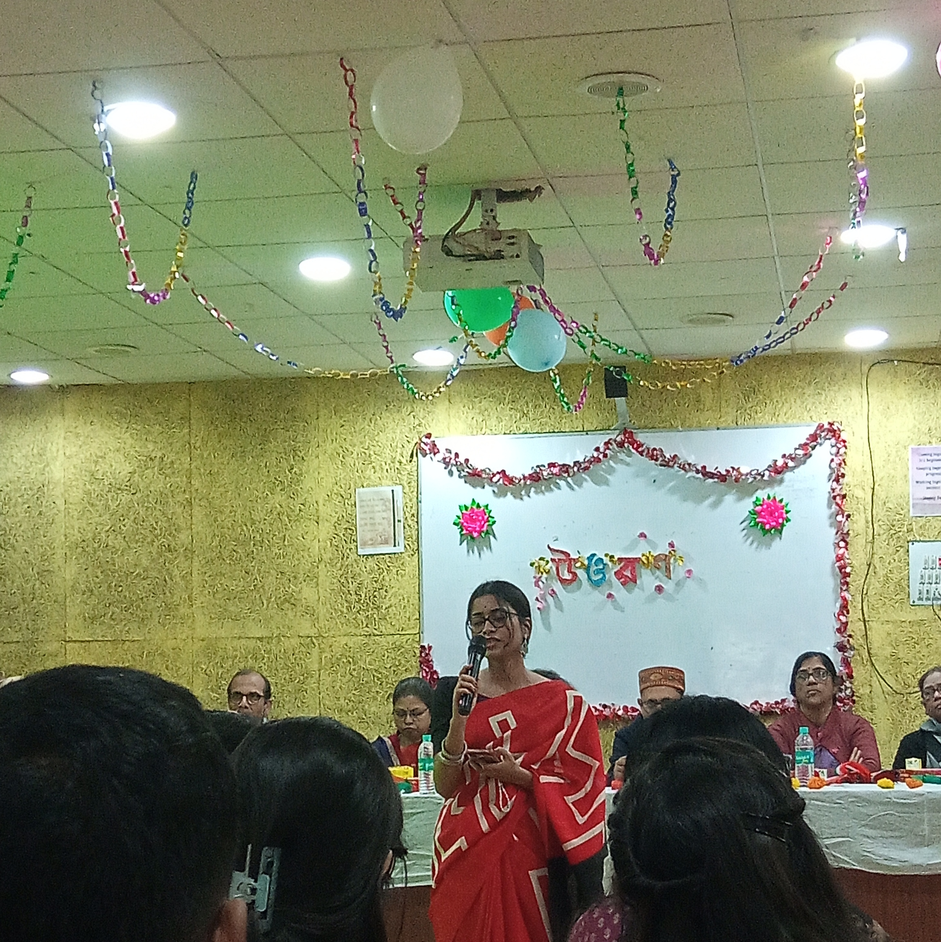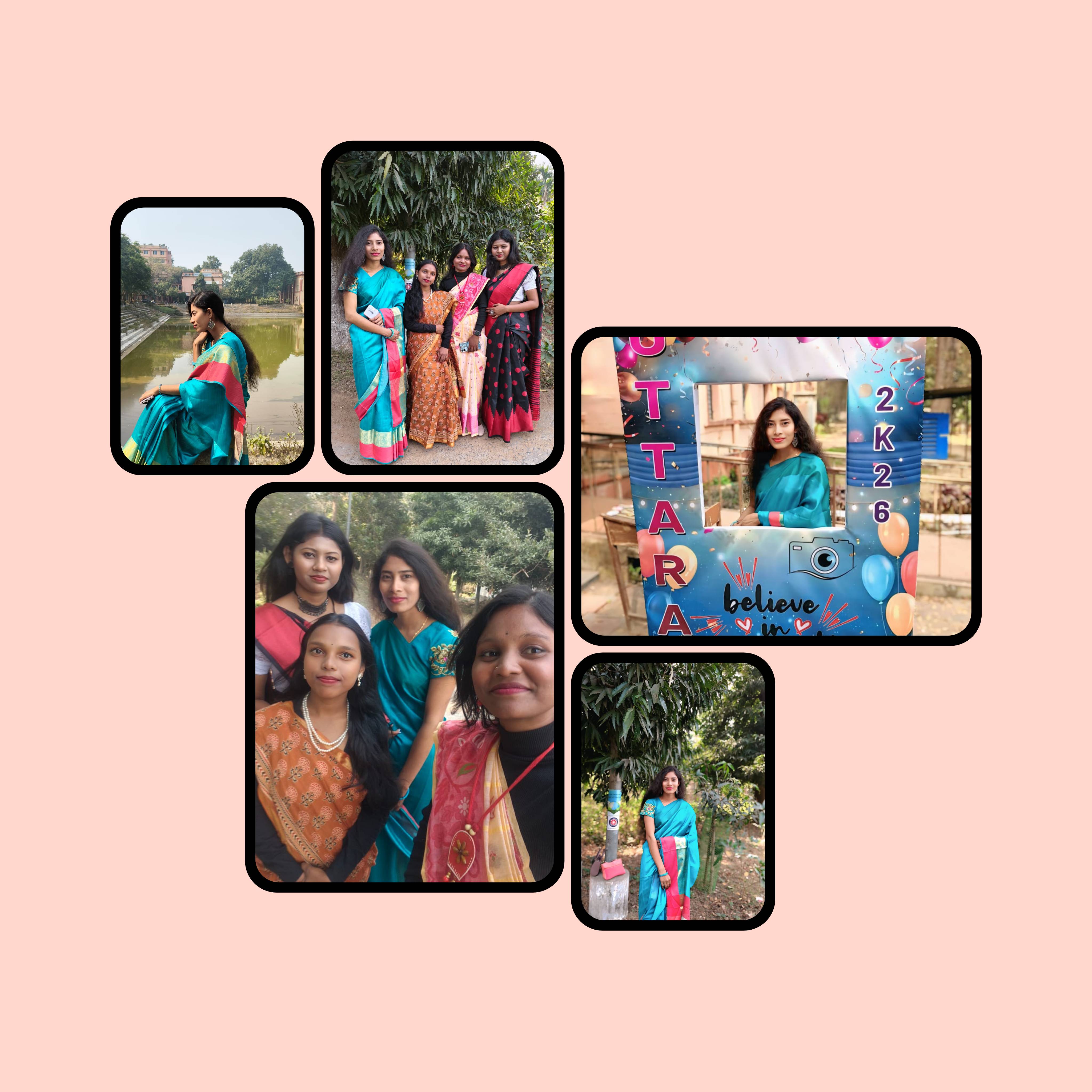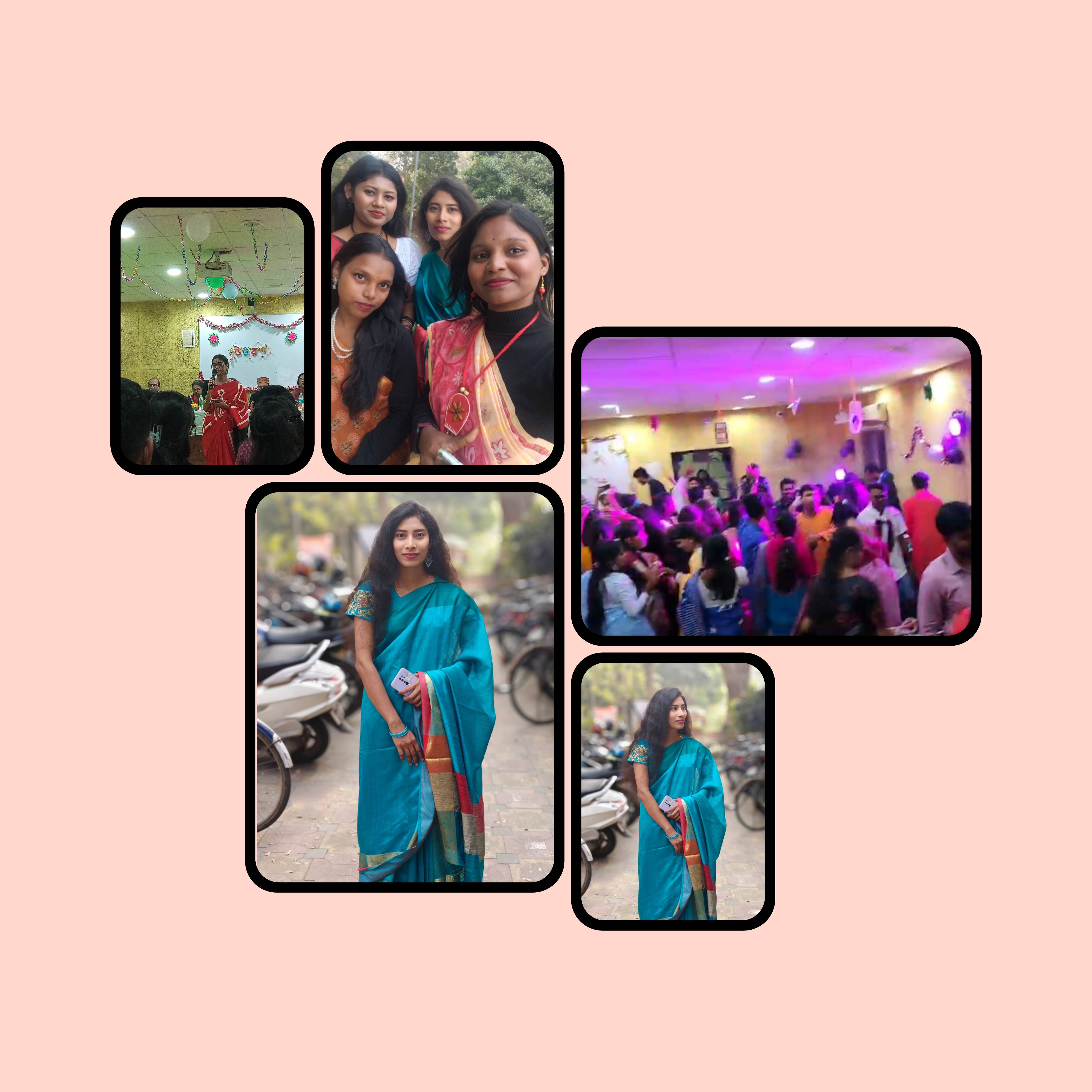 In the first session, after the teachers and faculty members had departed, refreshments were served on one side, while on the other, the juniors were welcomed with a rose and a file each. Meanwhile, to bid farewell to the seniors, each of them was presented with a rose, a file, and a commemorative crest. Many attendees also ventured outside—to the pond ghat or amidst the natural surroundings—to capture photographs to their heart's content. This was because, for this special occasion, the boys had come dressed in Panjabis and the girls in Sarees. My friends and I also headed to the pond bank to take pictures; consequently, we missed the opportunity to photograph those special moments of welcome and farewell. I, too—clad in a Saree—took a few photographs.