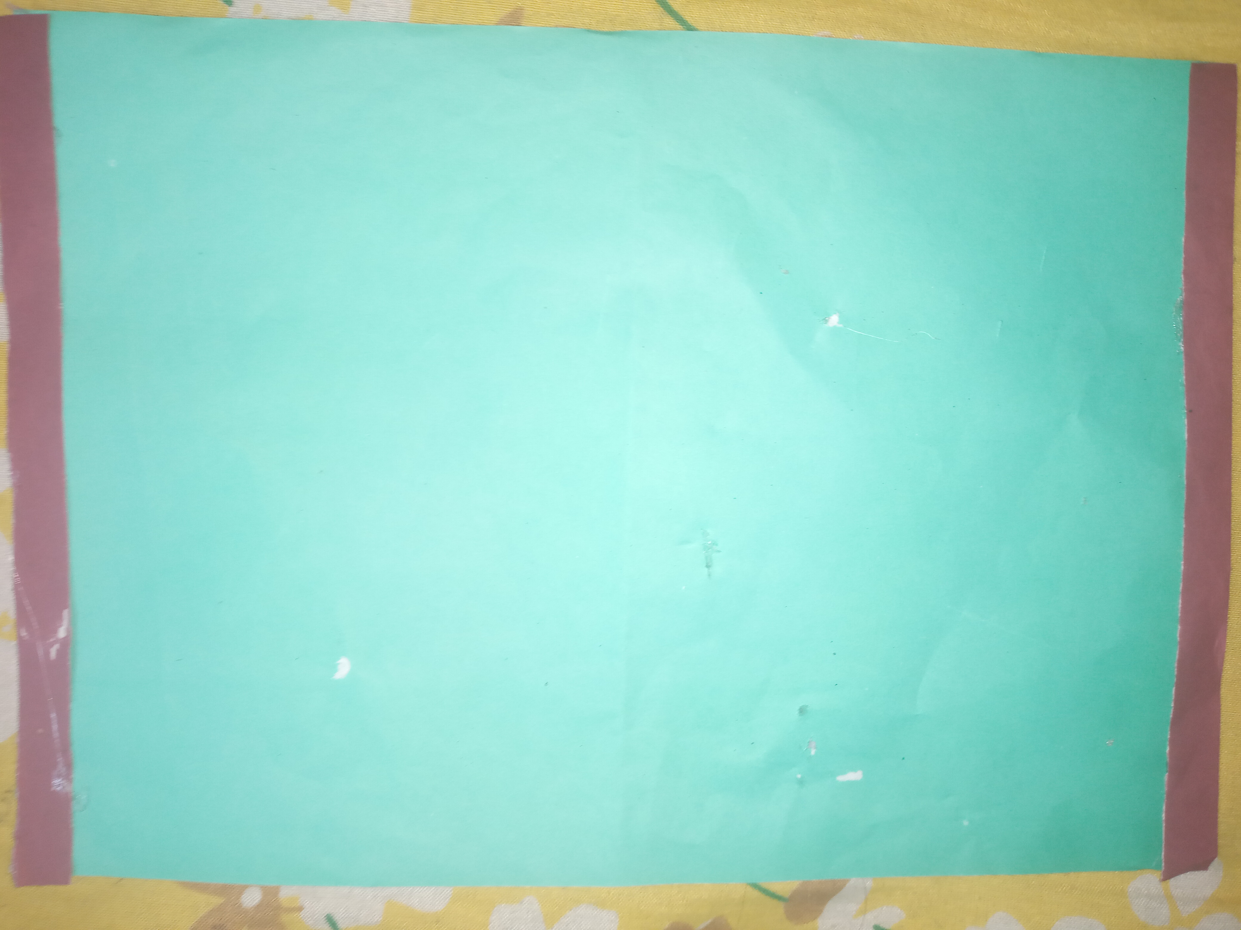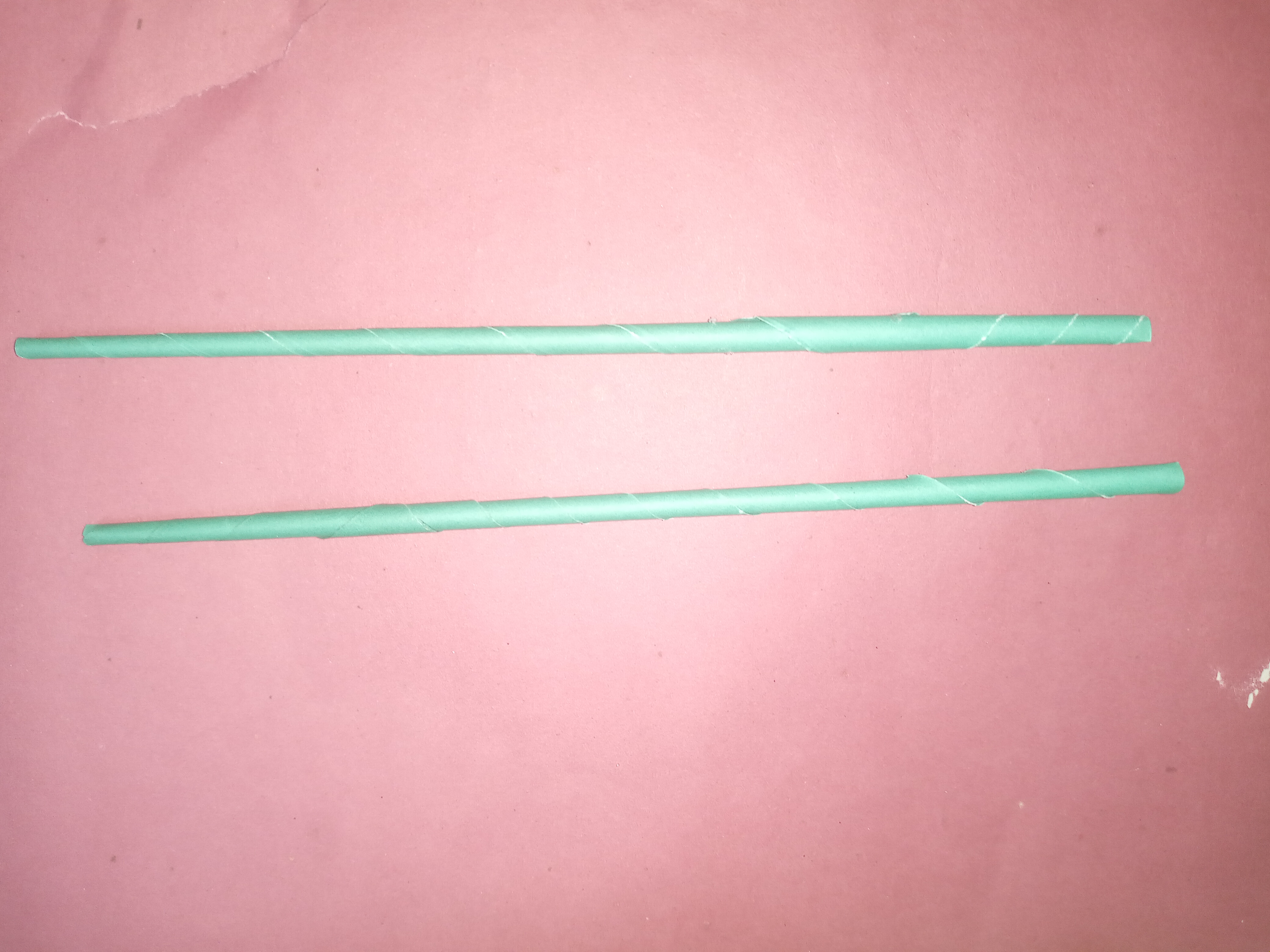 Then the green paper is cut perpendicularly by scissors and the cut green paper is pasted into two cylindrical shapes with paper glue.