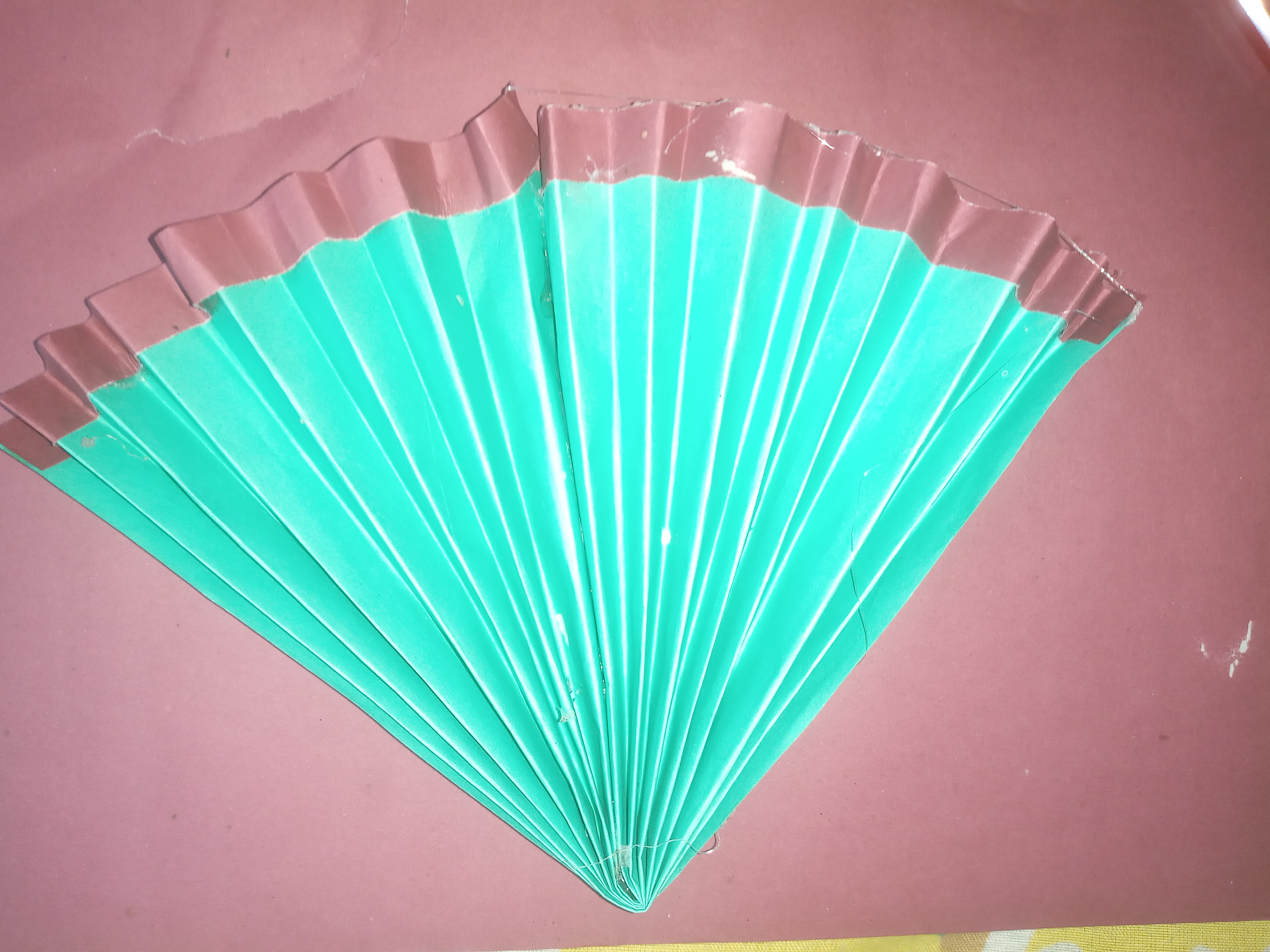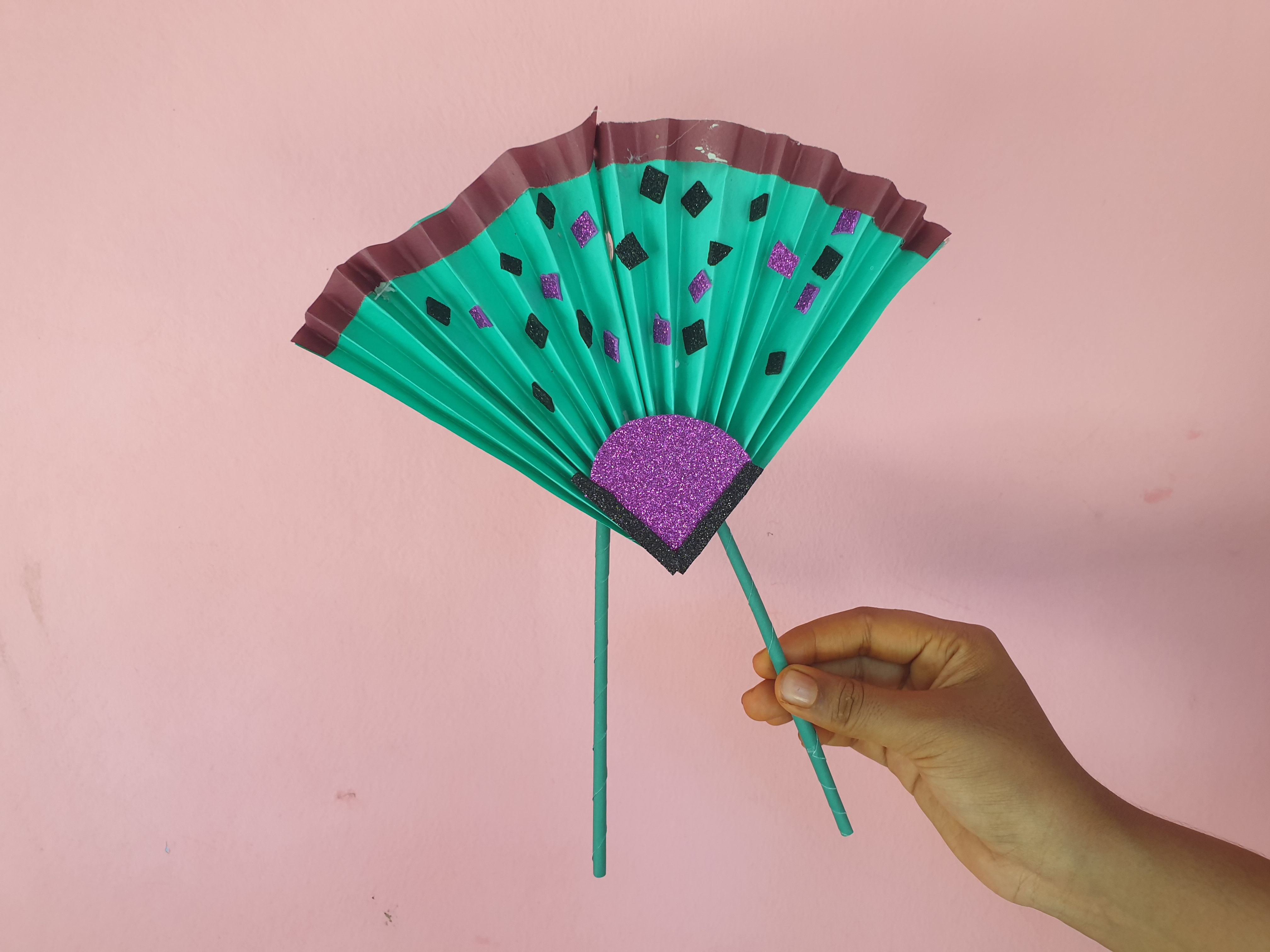 Finally, we finish the process of making the hand fan by connecting the two green paper stems of the previously prepared tube to the lower part of the hand fan with paper glue.