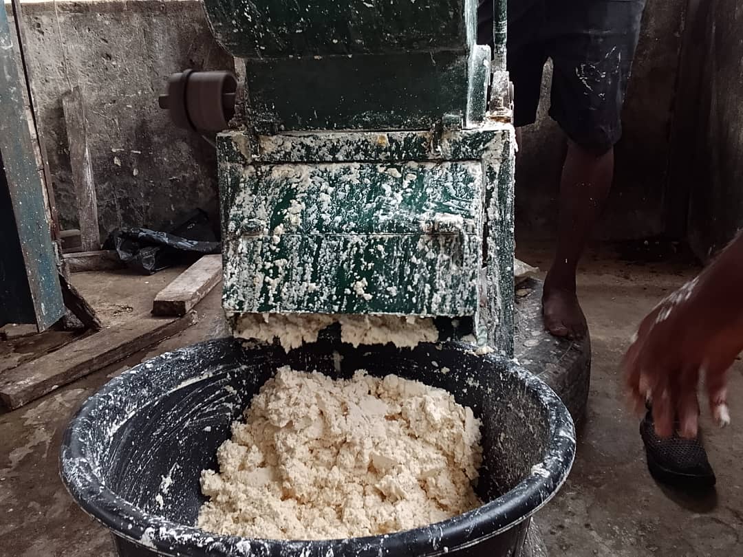 I took the cassava to the mill and then it was being grinded. See the grinding process here. You pick each cassava and put it in a grinder and allow grind it. It will turn a semi solid kind of thing and then do this till all the cassava has been grinded.