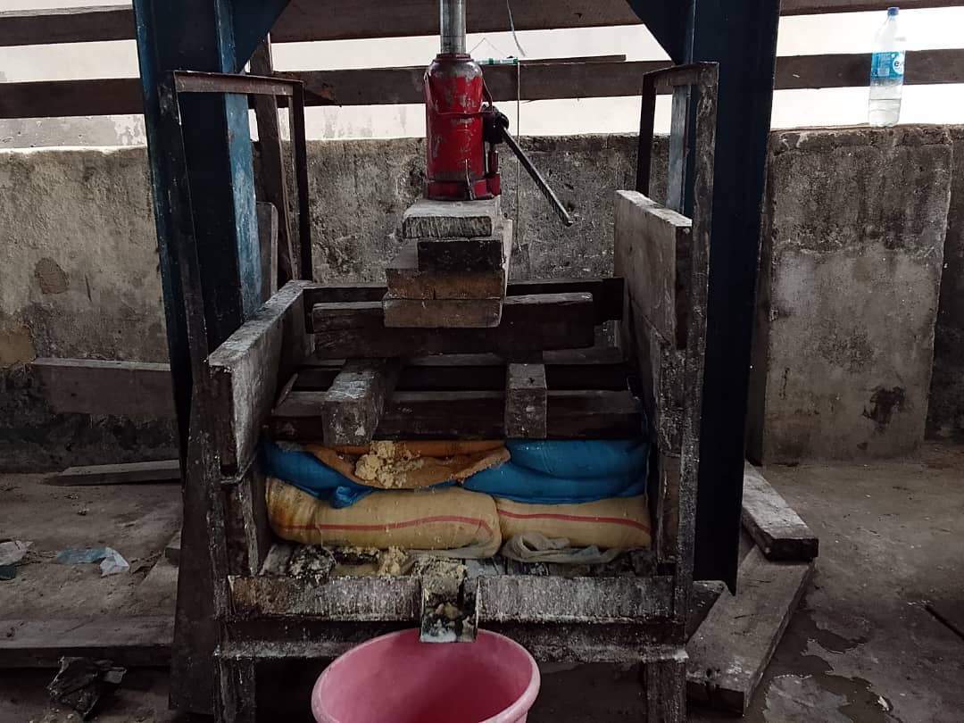 When that is done, put not too much amount of the grinded cassava into bags depending on how much they are and then take it to the dryer. What we have here in the mill is a manual dryer, it had to be turned and then the jack pressed the cassava then the water in there comes out. This makes the cassava dry enough so it doesn't get stiffen while trying to fry it.
