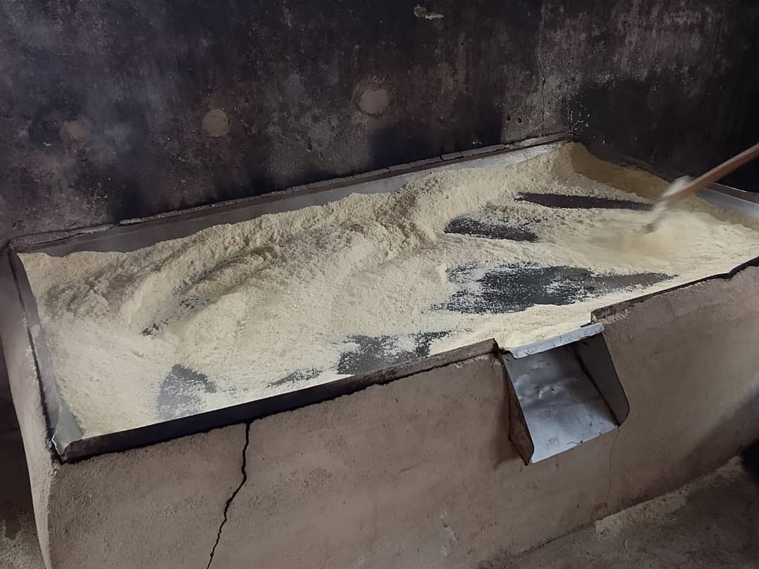 When the fryer is dry, go in with the sieved cassava and then turn it bit by bit so that it won't get burnt. Do this for 20 minutes and then take your garri out. This particular garri is so delicious, even if you want to sip it.