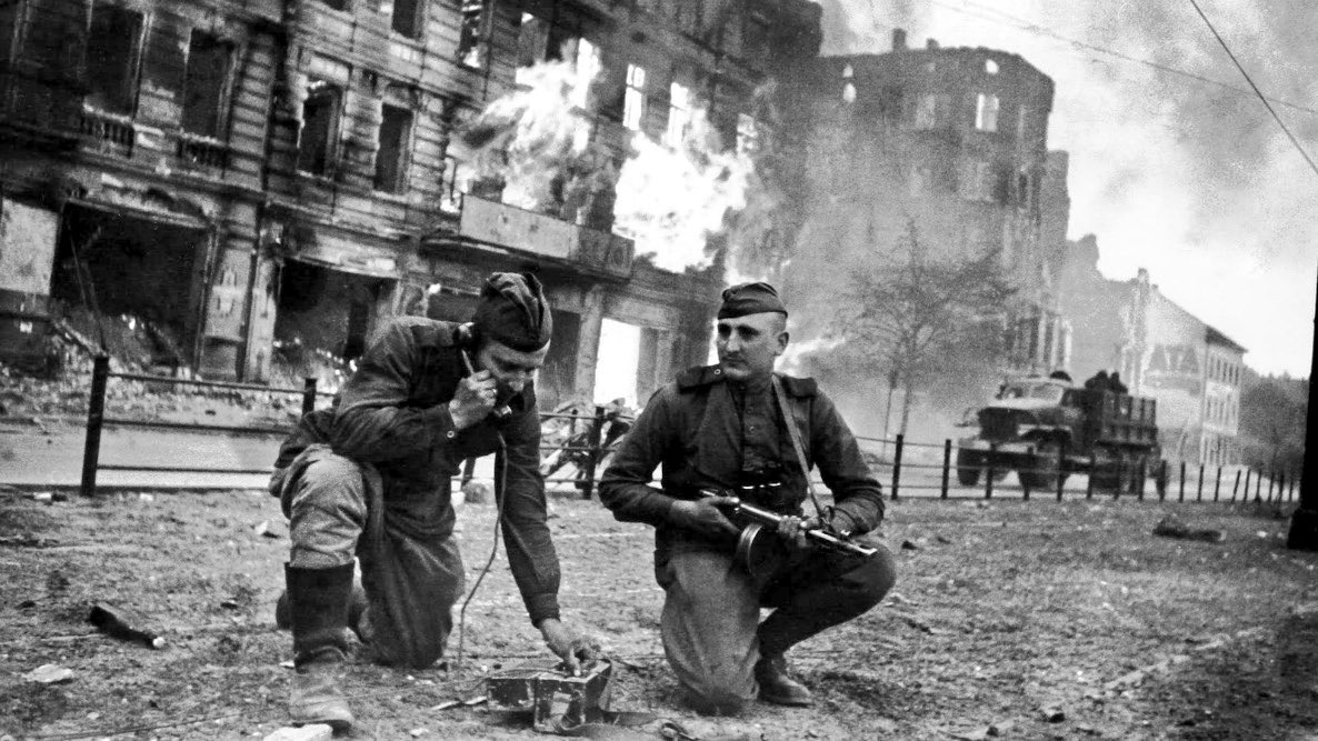 WW II Factshorsewasher (28)in #history • 7 years ago Two Soviet Army soldiers stop to use a field telephone during the Battle of Berlin as buildings erupt in flames behind them in April, 1945. #politics #busy #smokenetwork #speakyourmind