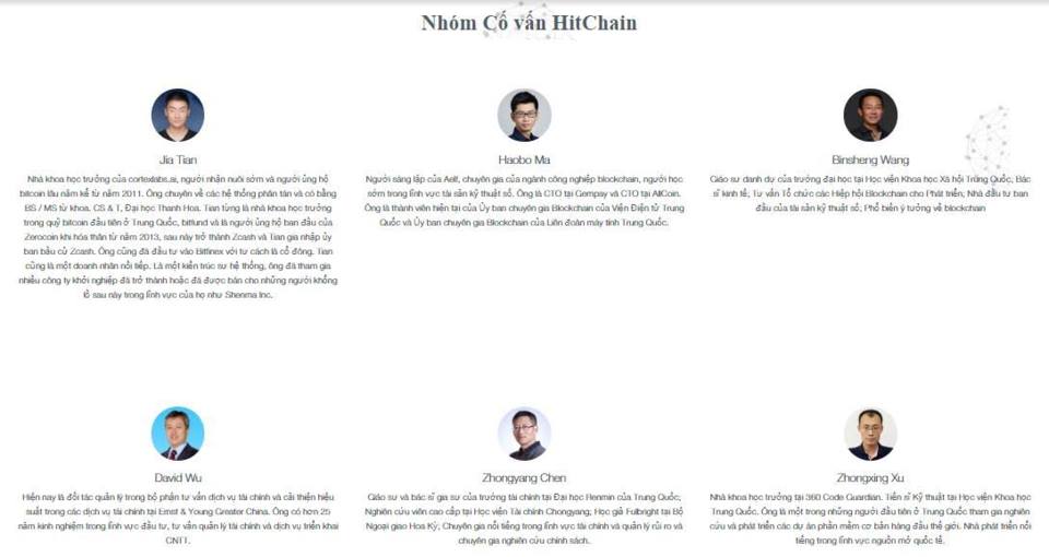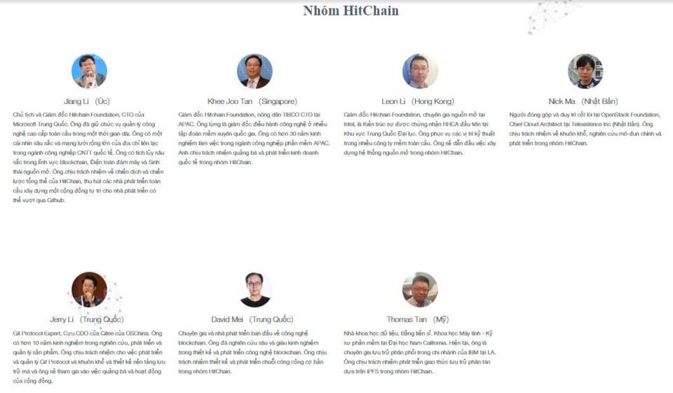 Jiang Li (Úc): Chủ tịch, giám đốc, nhà sáng lập của Hitchain; CTO của Microsoft Trung Quốc. Ông giữ chức vụ quản lý công nghệ cao cấp quốc tế. Đặc biệt ông Jiang có mối quan hệ khá rộng thân thiết trong ngàng IT quốc tế. Trong lĩnh vực Blockchain, Cloud Computing và Sinh thái Mã nguồn mở ông cũng có khá nhiều kinh nghiệm. Ông đang chịu trách nhiệm trong việc giám sát vận hành chiến lược HitChain cũng như thu hút các nhà phát triển quốc tế nhằm xây dựng phát triển một cộng đồng nhà phát triển tự quản lý tiên tiến hơn Github.