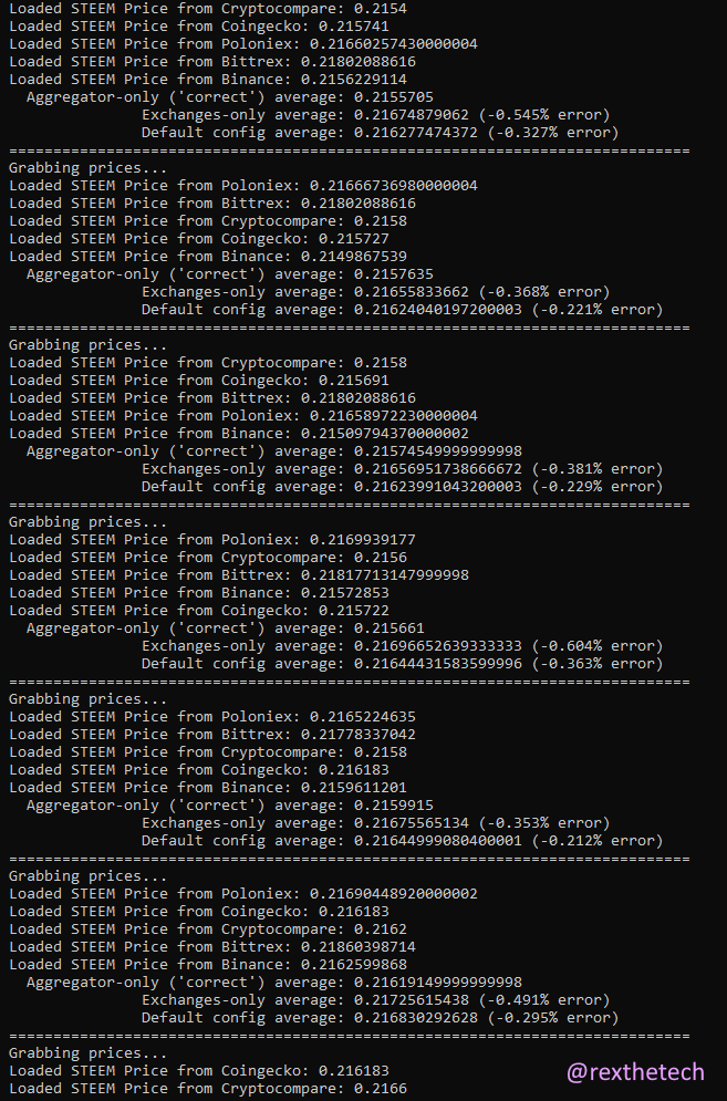 Above it's running on a 1 minute interval. In default config, the error is currently around +/- 0.3%. If running with exchanges only and no aggregators, which you're doing if running @yabapmatt's ancient version, it rises to +/- 0.6%.