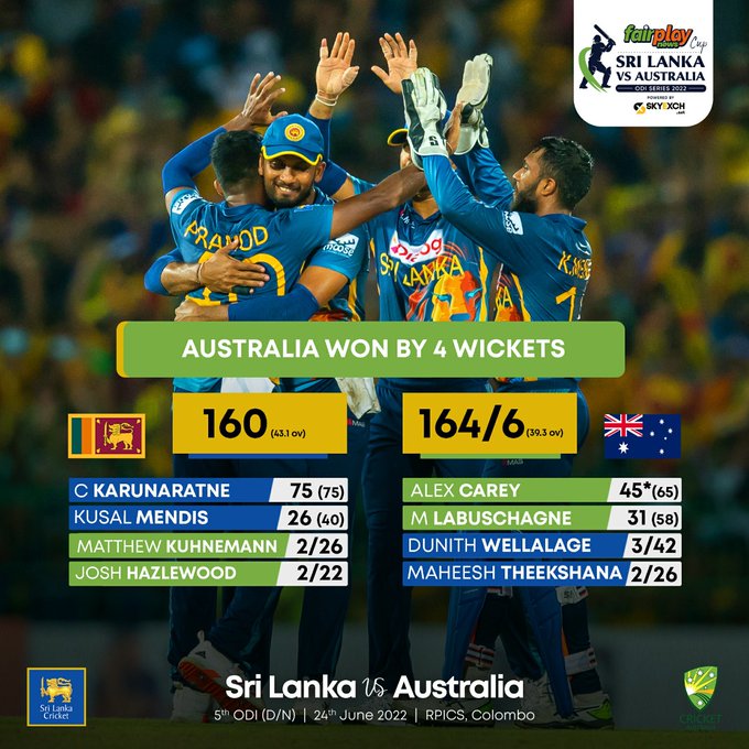 Australia defeated Sri Lanka in the 5th and final ODI on Friday but lost the series 3-2. Chamika Karunaratne (75 from as many balls) scored nearly half the hosts’ total of 160 in a feisty rear-guard, helping to put on 75 for the final two wickets on the way to the second highest ODI score by a Sri Lankan No.8.